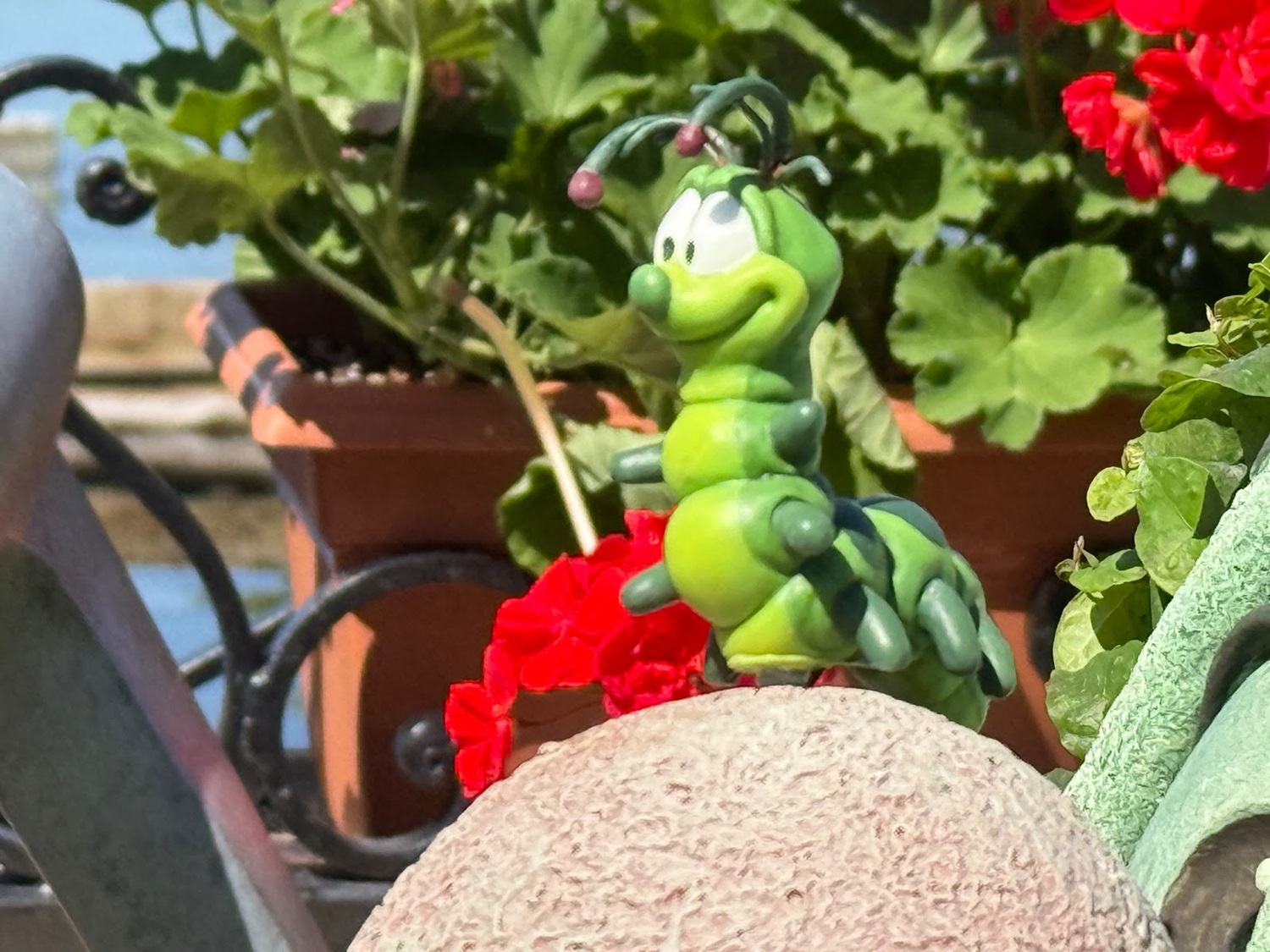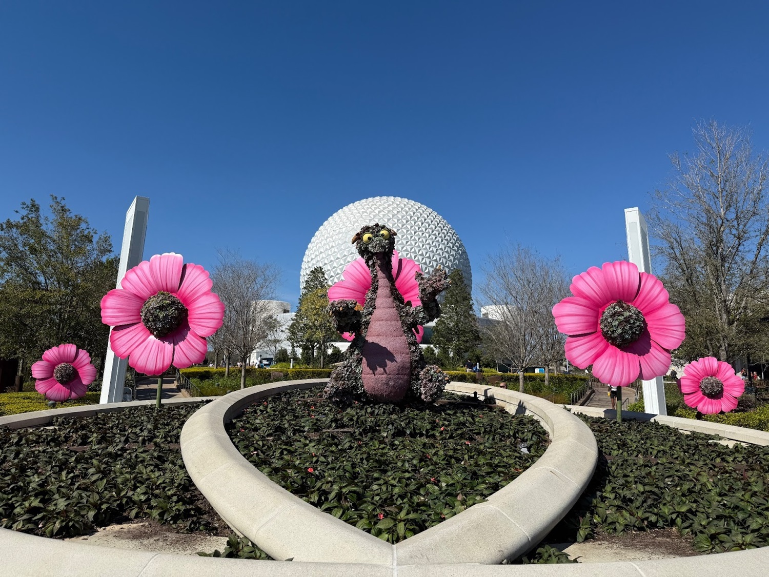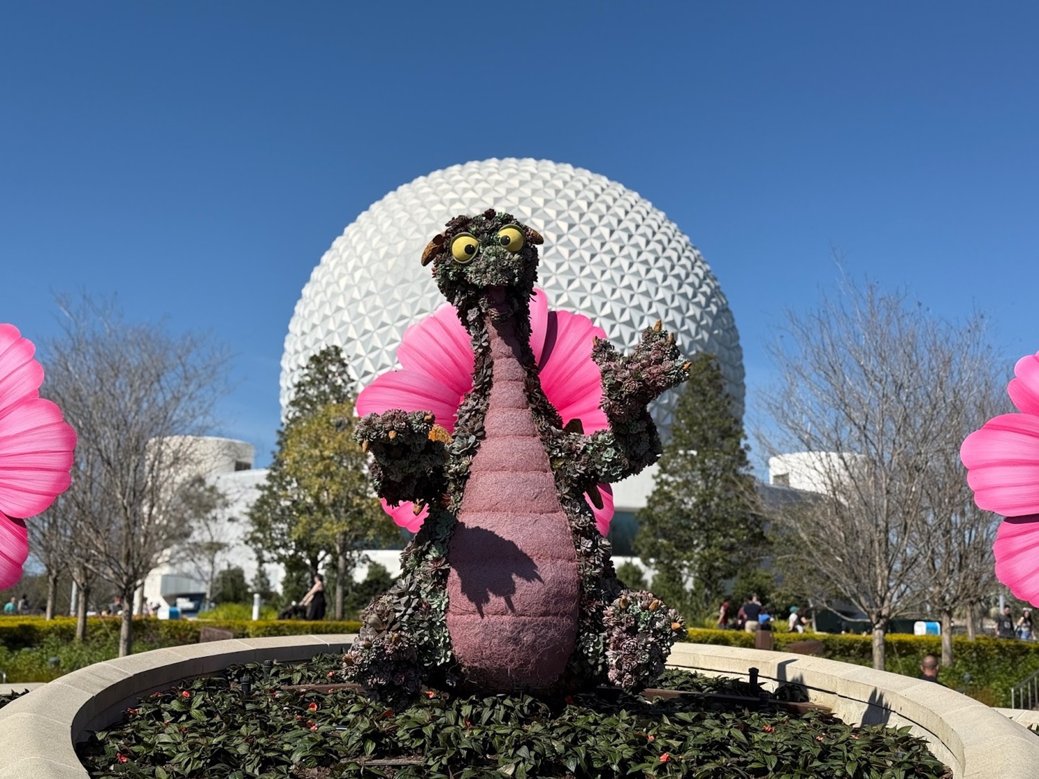 We’ll begin in the center of the park, where Figment and some colorful flowers have taken their place in the EPCOT logo-shaped planter.