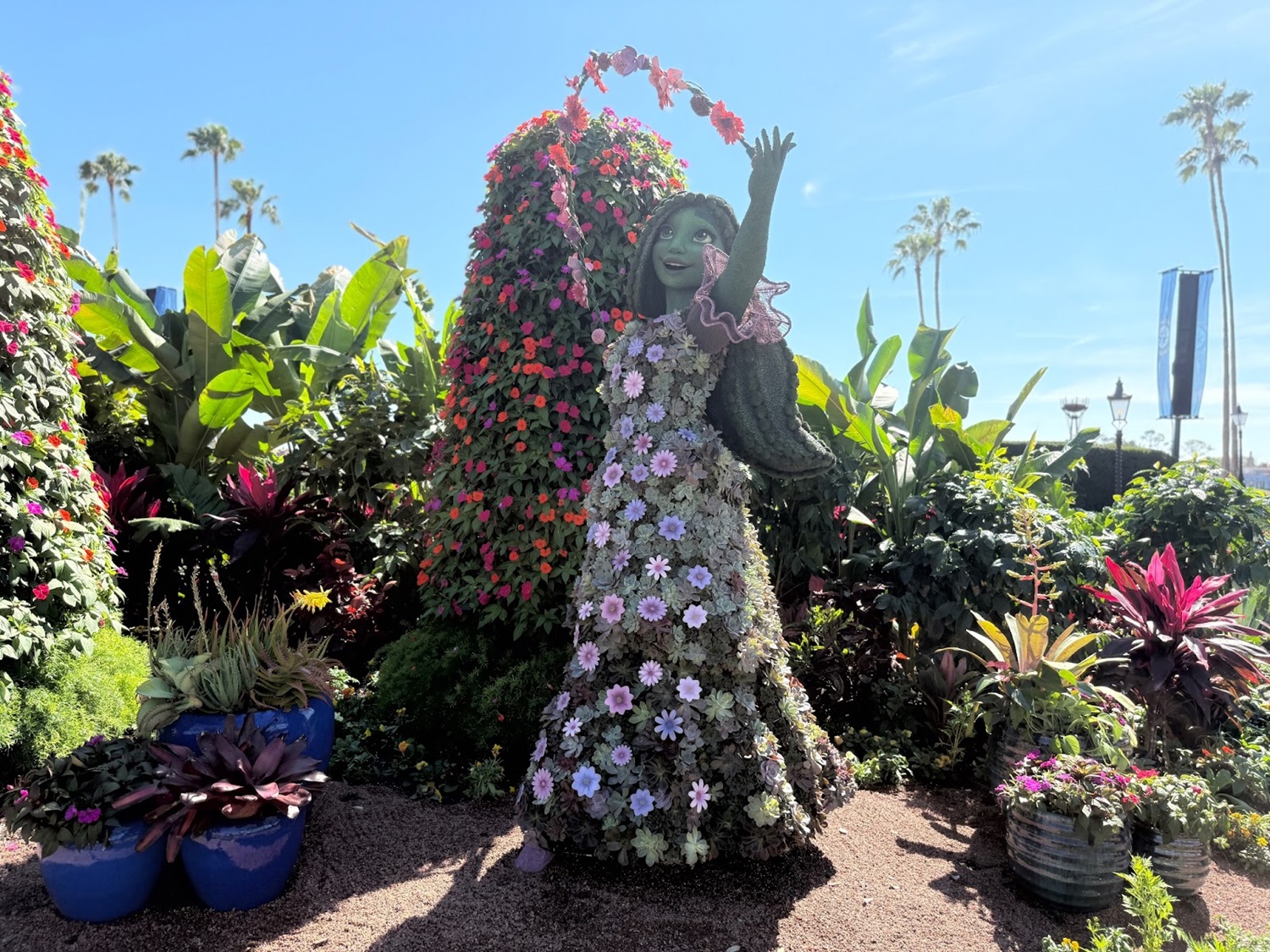 Over at the entrance to World Showcase, the large Encanto topiary collection has been installed – featuring Mirabel, Isabella, Luisa and Antonio.