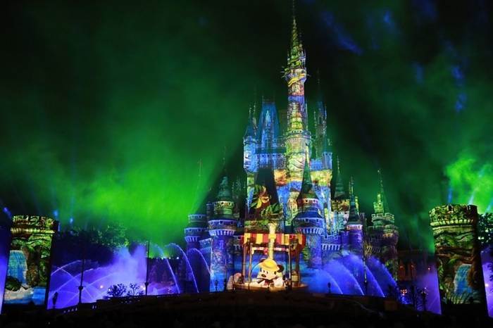 The first land represented in the show was Adventureland, which started out with a cool rendition of the Enchanted Tiki Room because we got to hear some Japanese lyrics and see Stitch, the star of the show in Tokyo. The show then moved along to show Mickey as a conductor on the Jungle Cruise, which was so much fun to see a character on such an iconic vehicle. Throughout the course of the show, there were a lot more of these fun moments, so get ready because the next one appeared right away with Mickey falling onto a barrel that found its way into the Pirates of the Caribbean attraction where projection mapping helped him navigate his way through various scenes from the attraction. This section also really showcased the water fountains that were all around the castle, especially because the show didn’t use that many fireworks, giving Celebrate a bit of a World of Color feel.