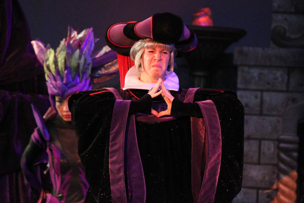 The show then jumped into a villain segment, which again began with the Evil Queen transforming into her Hag appearance, though this time she basically sang a rock song, which was super fun because it was both out of place and perfect. The action then transitioned right into Judge Frollo who came out with some spooky monks to sing part of “Hellfire" while some real fire was blasted in the background. To close it out, Maleficent appeared with some henchmen to parade around the stage and cause the thorny vines to appear. Prince Phillip then emerged to defeat Maleficent and unveil Aurora who he awakened with a kiss.