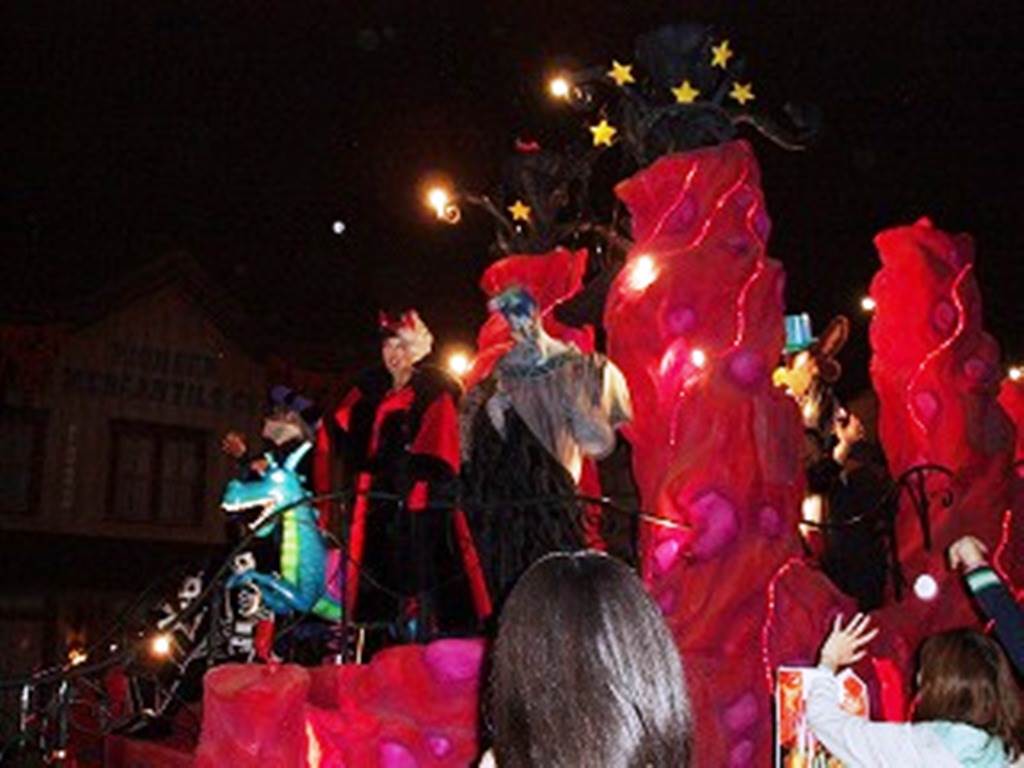 Goofy was the next member of the Fab Five to show up, this time decked out as a knight in front of a castle turret, with a squadron of knights in front of him. He needed to protect all his friends from the villains behind him, Pain and Panic chaperoning Cruella De Vil around for some reason. Their float was a sort of hellish landscape to fit their evil demeanor.