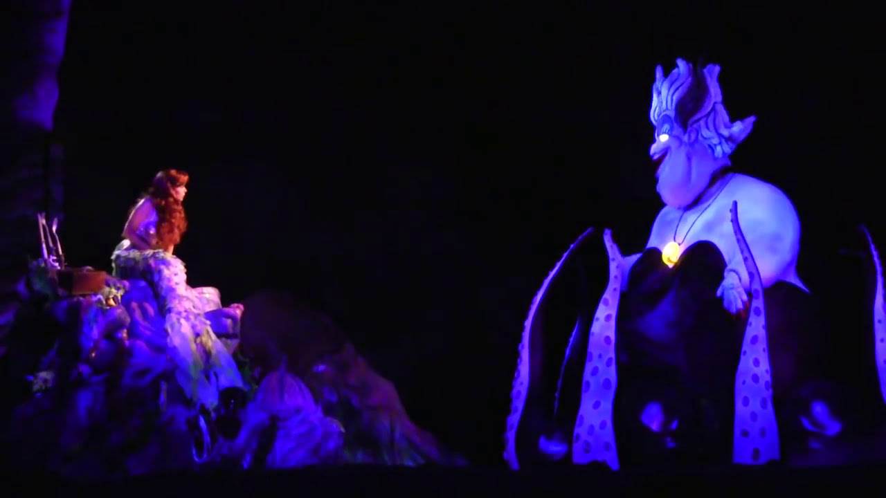 The opening effects of the show really helped set it apart right from the outset with bangs and flashes and some cool ocean animation that helped everyone get “Under the Sea," which just so happened to be the opening song of the attraction. “Under the Sea" looked a bit odd against a black background to hide the puppeteers, but it all made sense by the end when there were over twenty sea creatures on the stage at once.