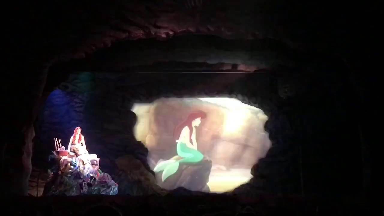The story continued with Ariel sitting on a rock and talking to an off-stage King Triton before letting us in the audience know that she wanted to be “Part of Your World." The actress playing her actually got the chance to sing her heart out and she was pretty good, I must say. The only weird part was that while she sang, there was an animated montage in the back which featured a lot of Ariel in it, so you could see two of her at the same time.