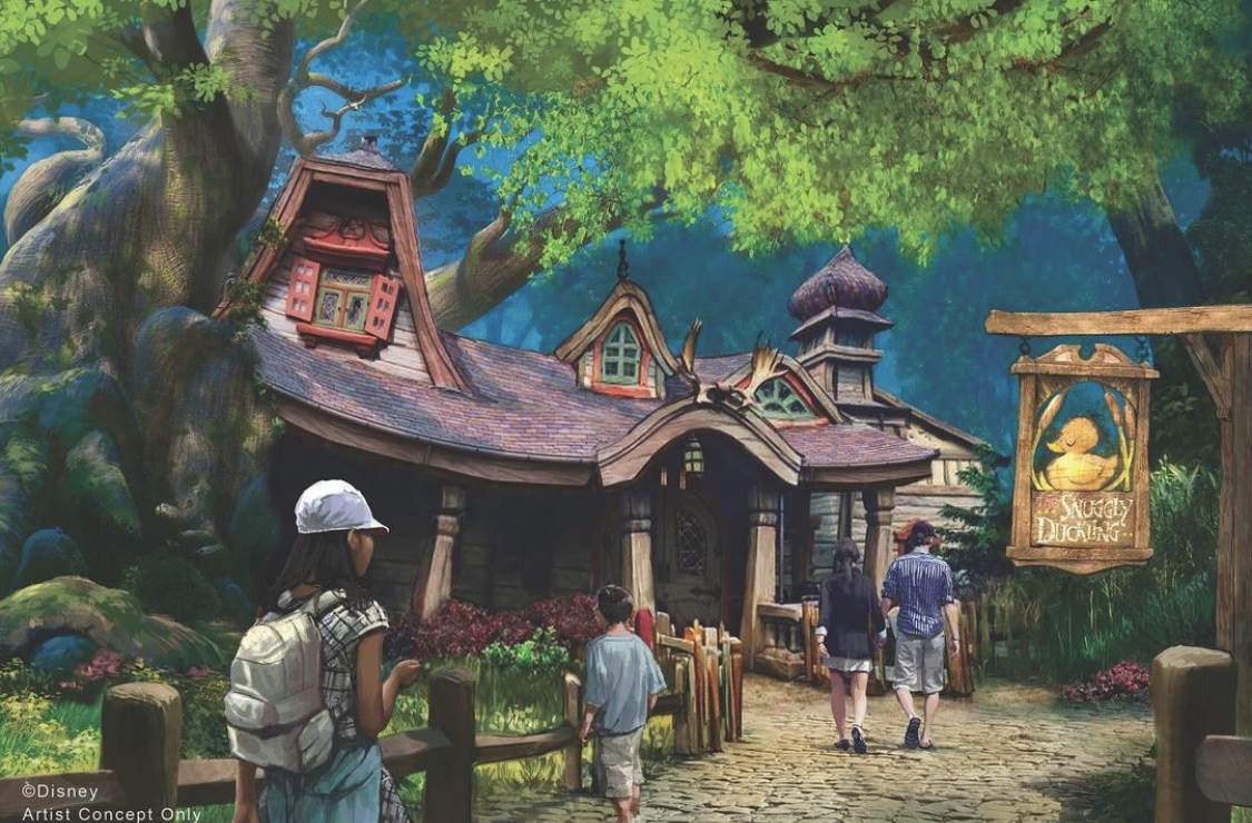 - The restaurant is hidden behind the foliage of a massive tree that is partially growing into the building, and the iconic Snuggly Duckling sign by the entrance welcomes guests inside. The interior of the restaurant brings to life the world of the film in its rooms, recreating places from the film such as the tavern and stable. Guests can delight in gazing upon the décor, which depicts the happily-ever-after stories of the tavern’s lovable ruffians.