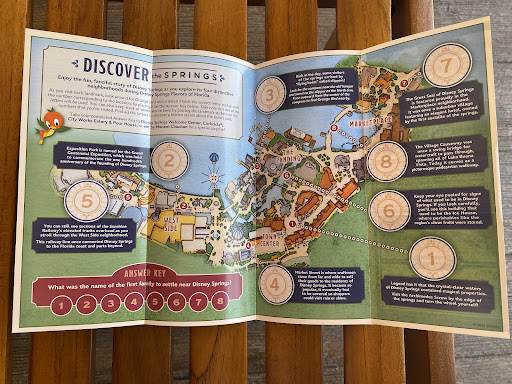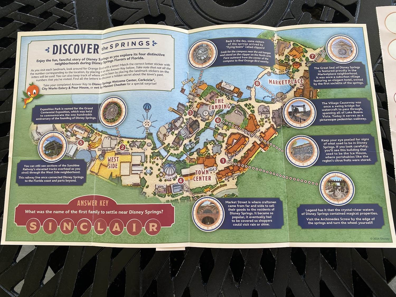 With the activity, as you visit each landmark on the map, you’ll have to look around the area for Orange Bird, who is accompanied by a letter. Once you match the correct letter sticker with the number corresponding to the location in the answer key, you’ll discover the name of the first family to settle near Disney Springs (according to the lengthy backstory written by Imagineers).