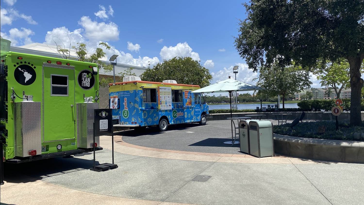 Heading into West Side, a stop at the Exposition Park (home of the food trucks), and (in the backstory) named for the Grand Centennial Exposition commemorating the (again, fictitious) 100th anniversary of the founding of Disney Springs.