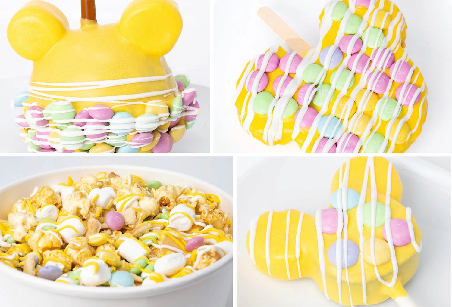 - Mickey Spring Caramel Apple: Granny Smith apple covered in caramel, dipped in yellow-colored chocolate coating with Springtime M&M’s Milk Chocolate candies, and drizzled with white chocolate (New)