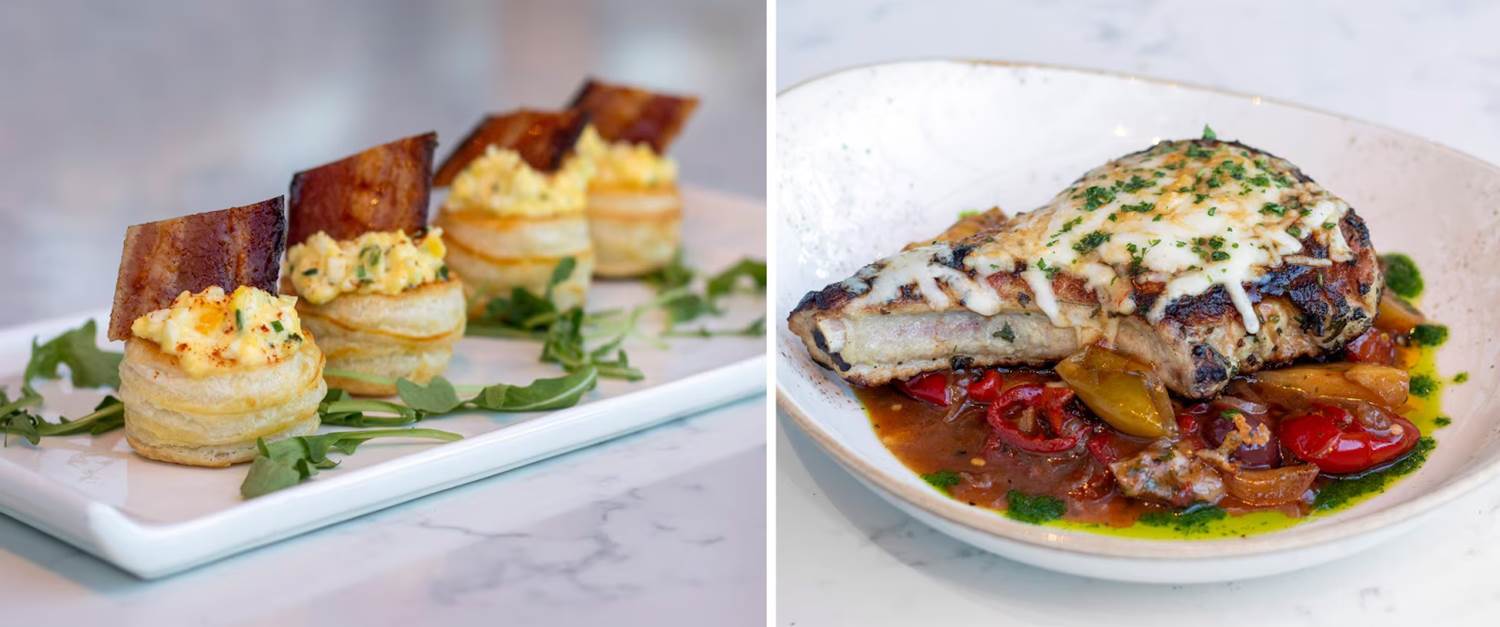 - Truffled Egg Salad Tarts: Truffled egg salad with sweet relish in a puff pastry tart topped with maple bacon and smoked paprika (New)