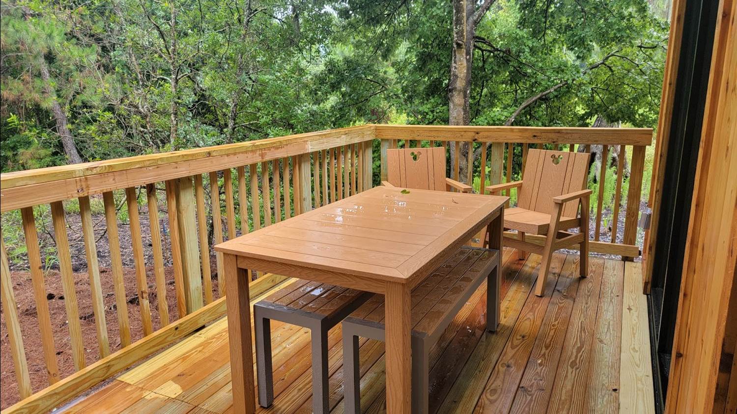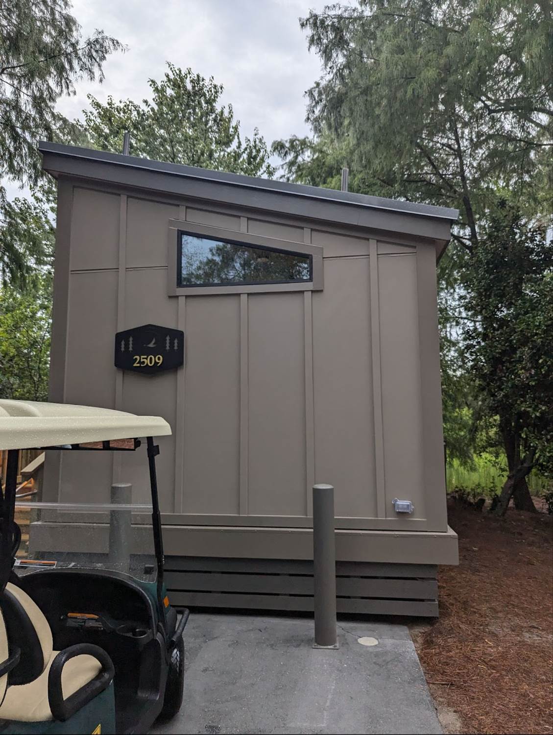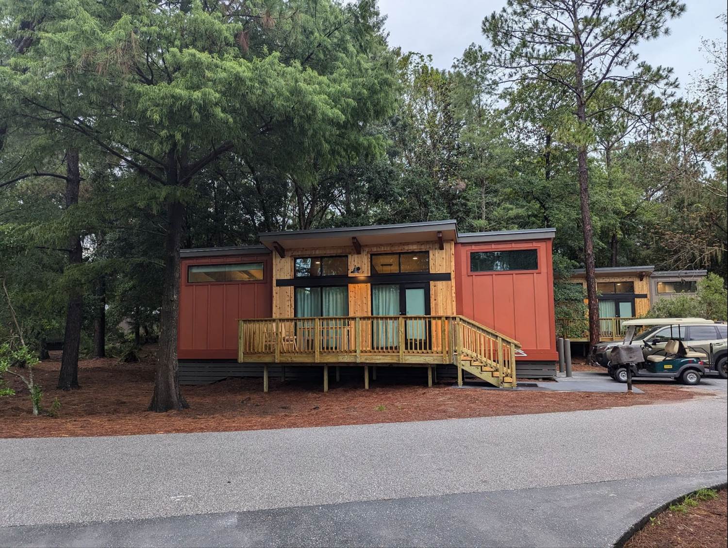 As you can see, the cabins do have a few different exterior colors. Outside you’ll find golf cart parking, a deck, and outdoor dining area. There’s also a grill available outside each cabin.