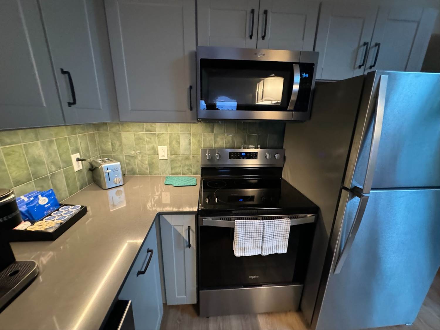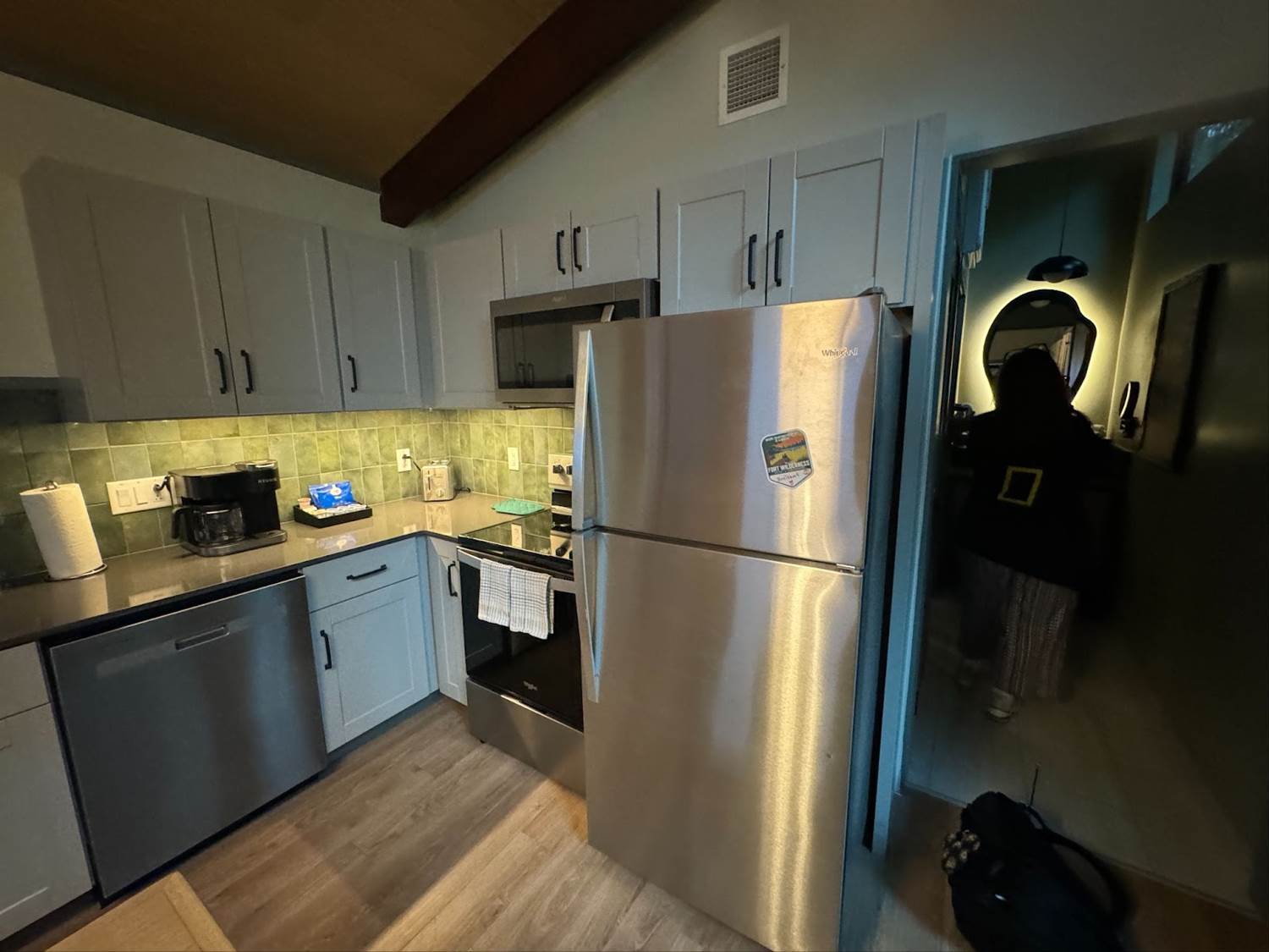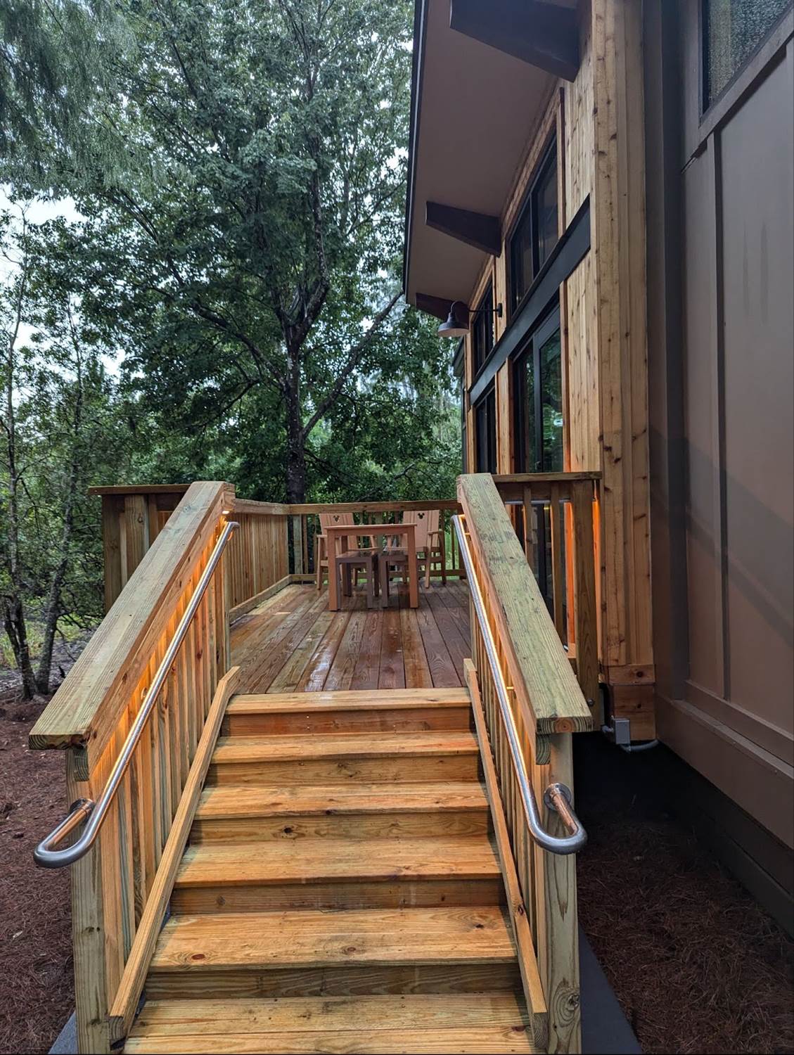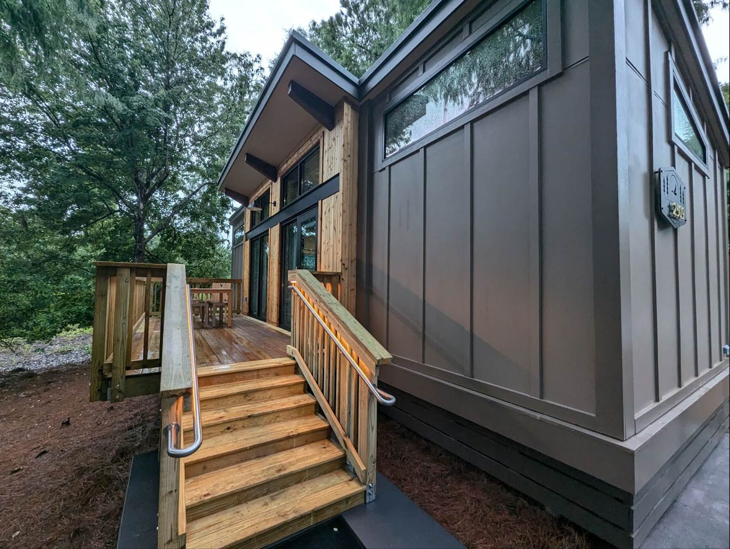 As you can see, the cabins do have a few different exterior colors. Outside you’ll find golf cart parking, a deck, and outdoor dining area. There’s also a grill available outside each cabin.