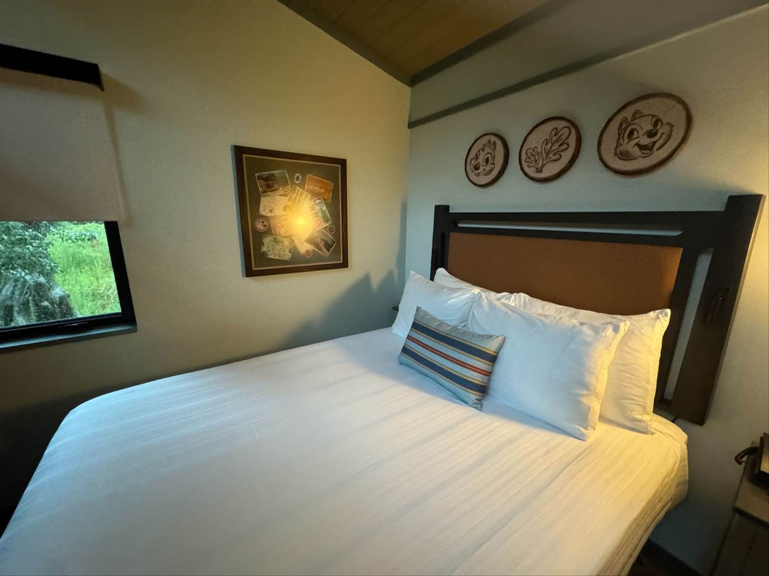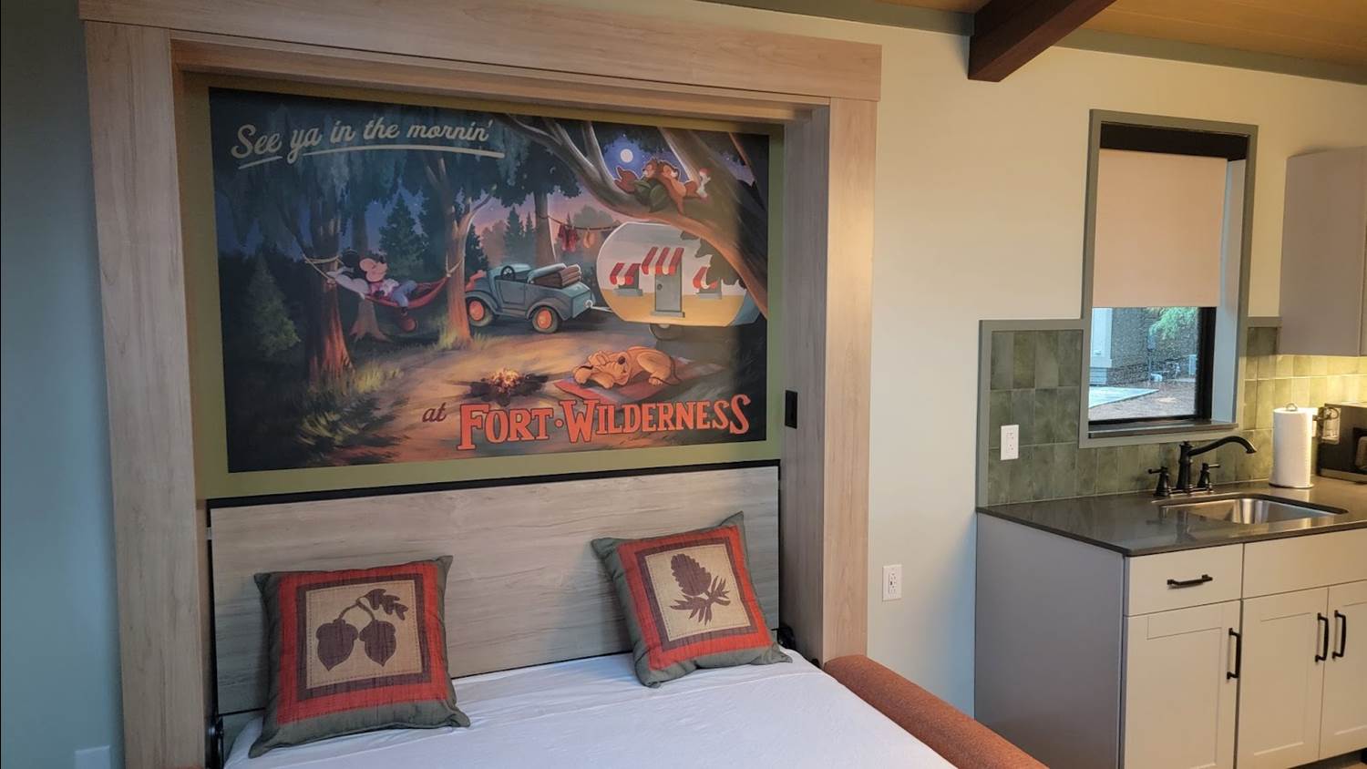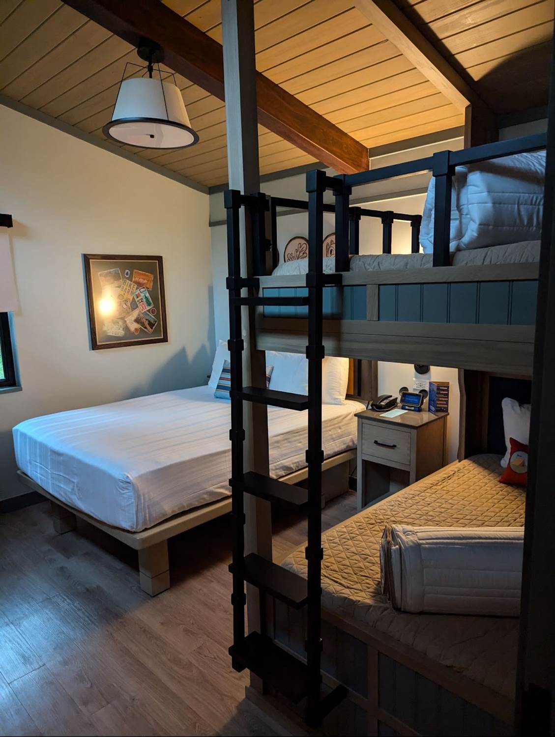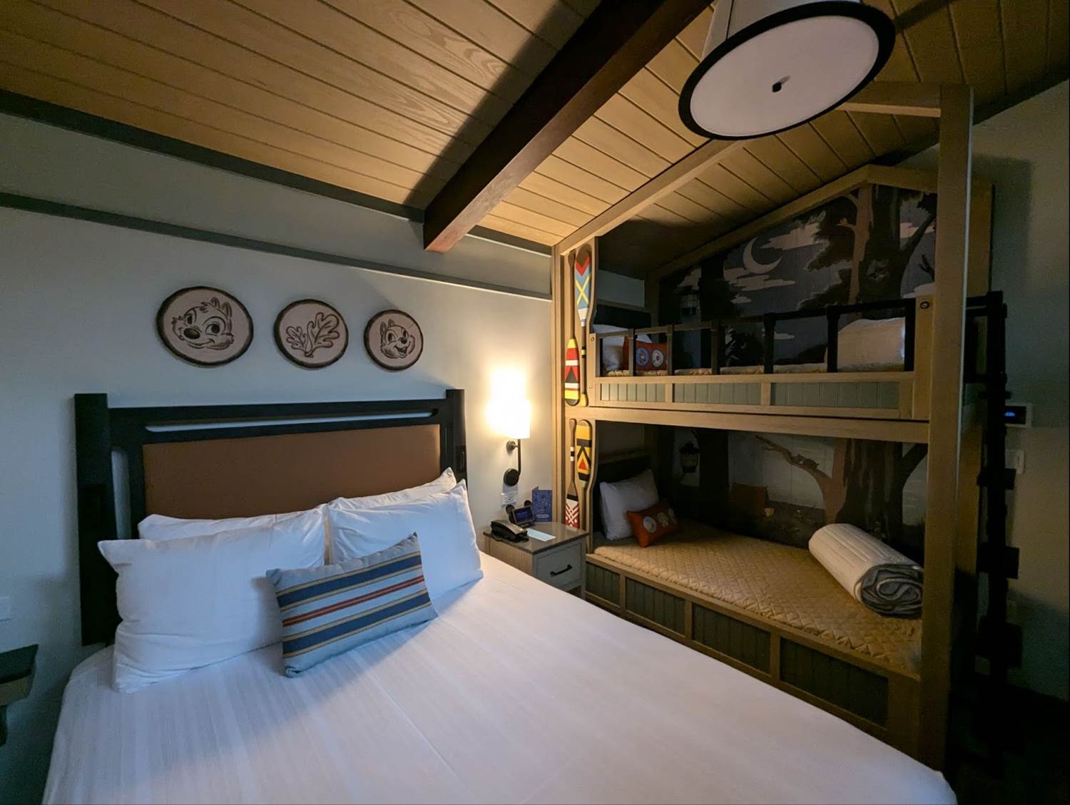 The spacious bedroom keeps the beloved bunk beds from the old Fort Wilderness cabins, with a more modern aesthetic. The bunk beds include fun and vibrant canoeing paddles, along with a chipmunk mural along the wall.