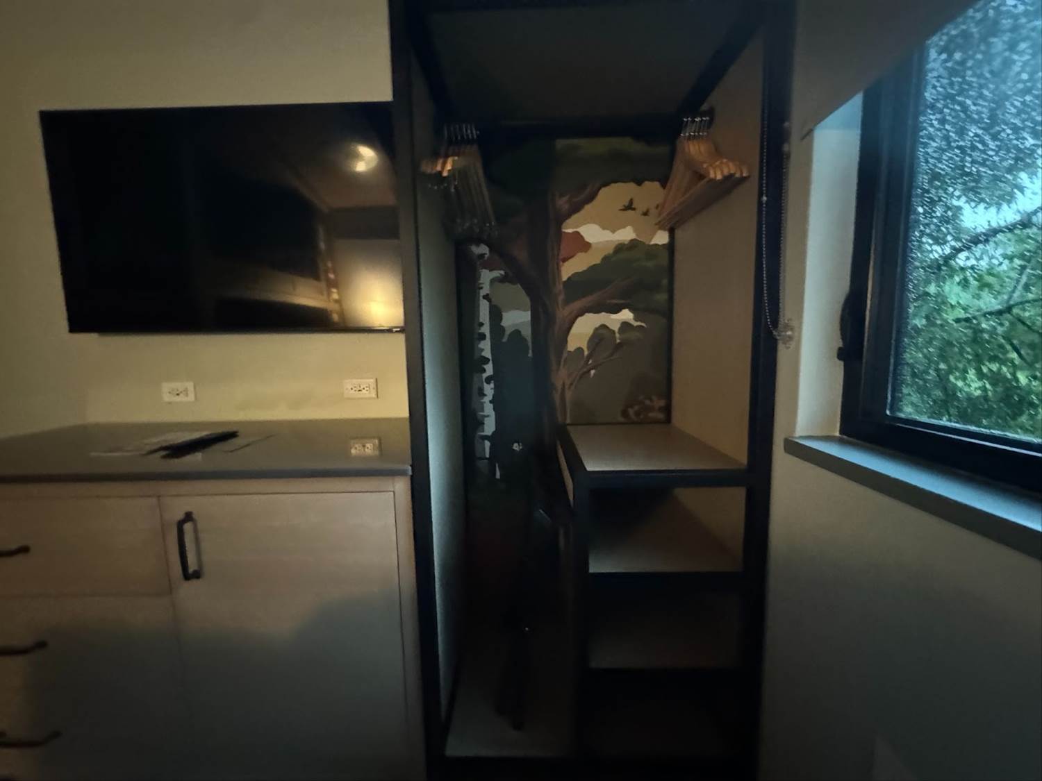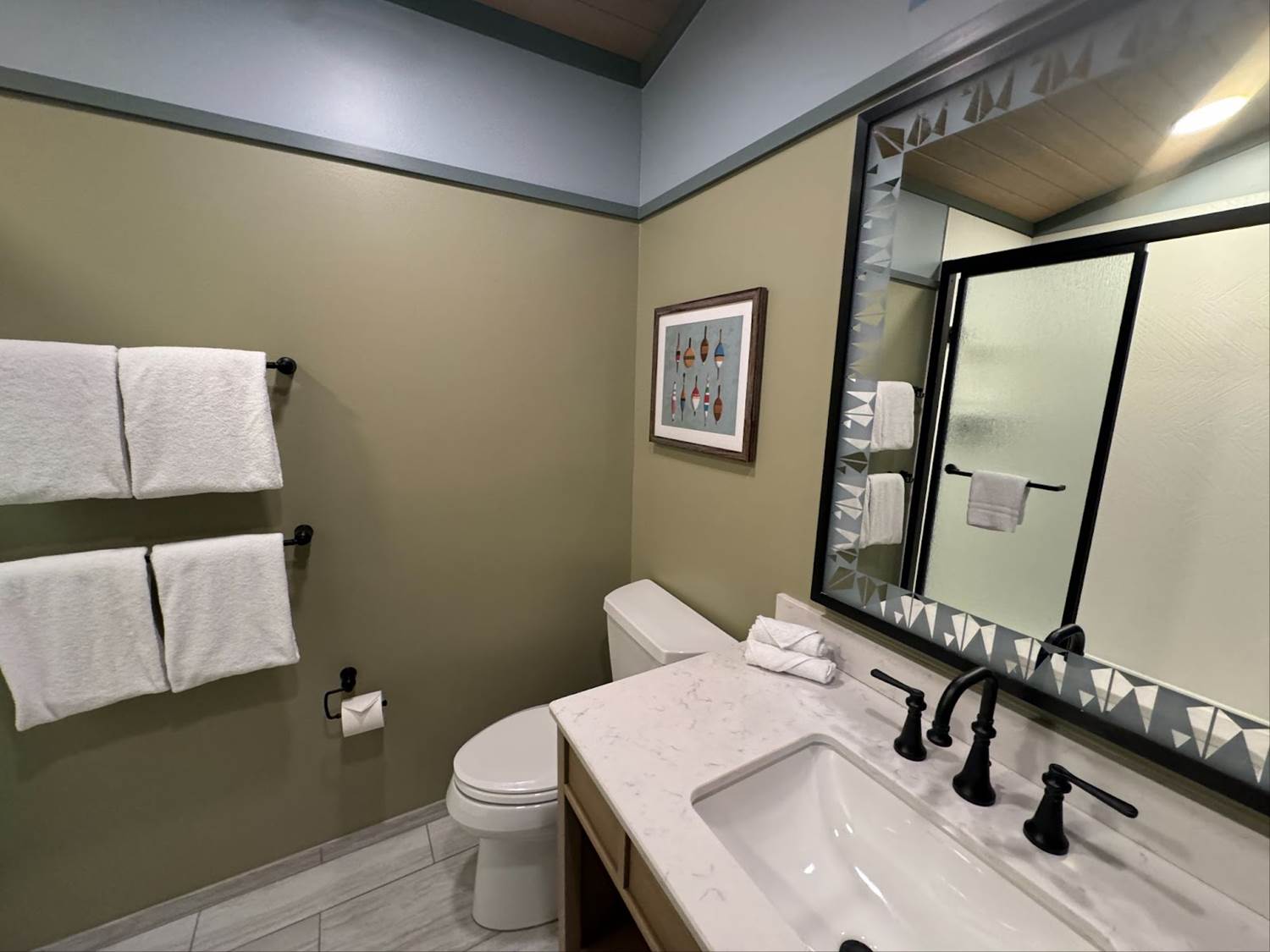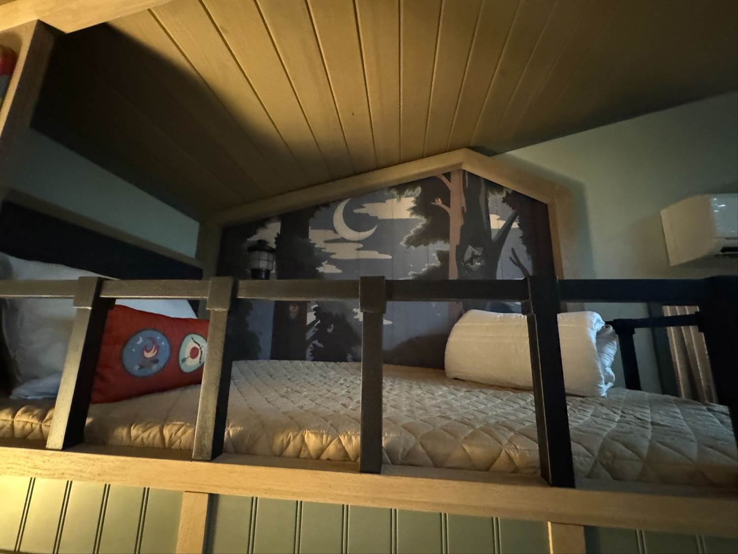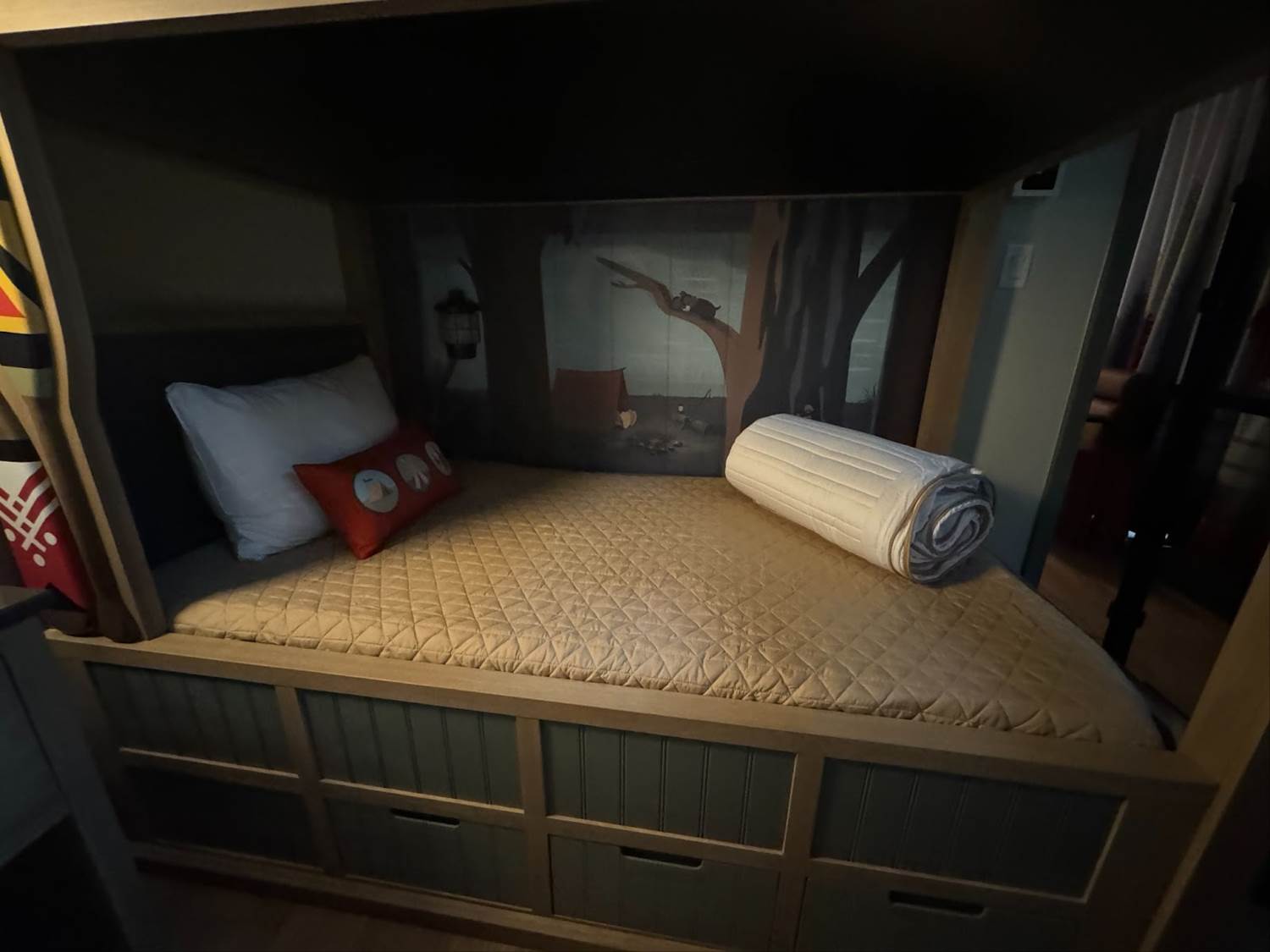 The spacious bedroom keeps the beloved bunk beds from the old Fort Wilderness cabins, with a more modern aesthetic. The bunk beds include fun and vibrant canoeing paddles, along with a chipmunk mural along the wall.