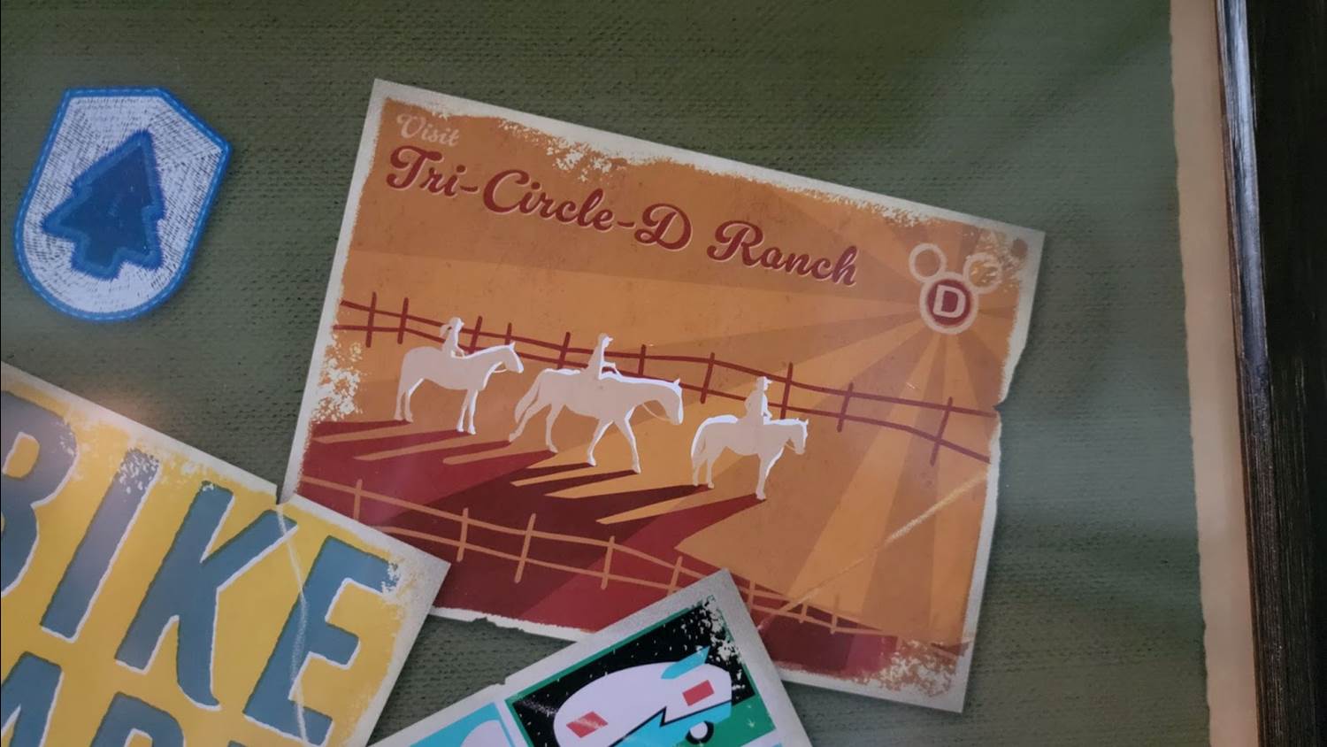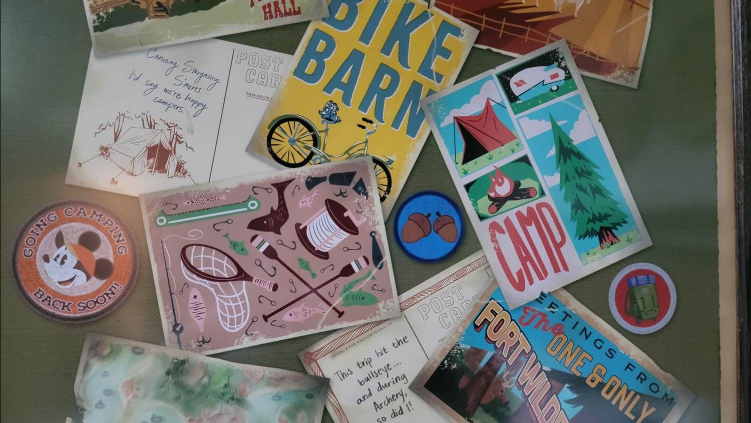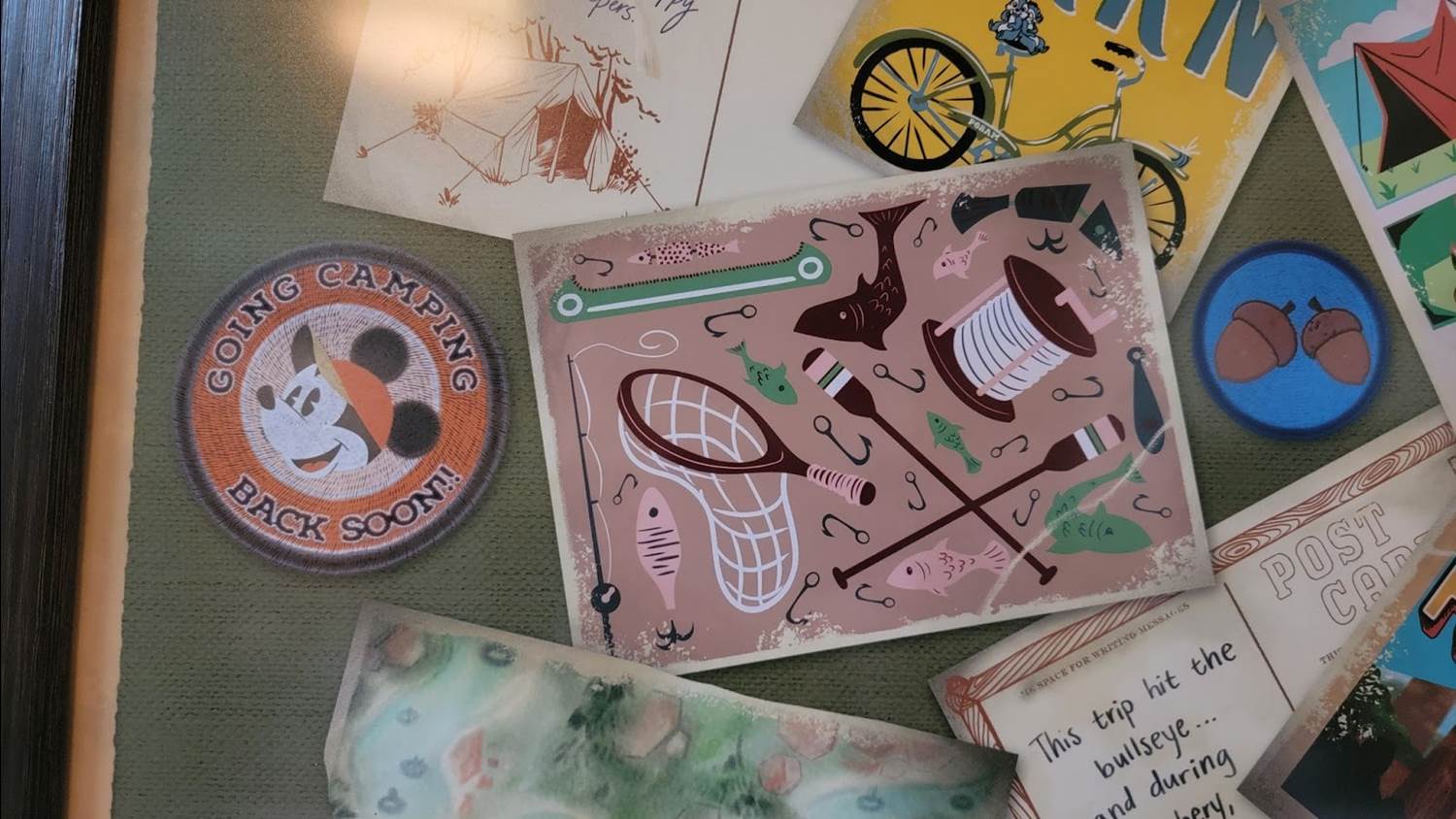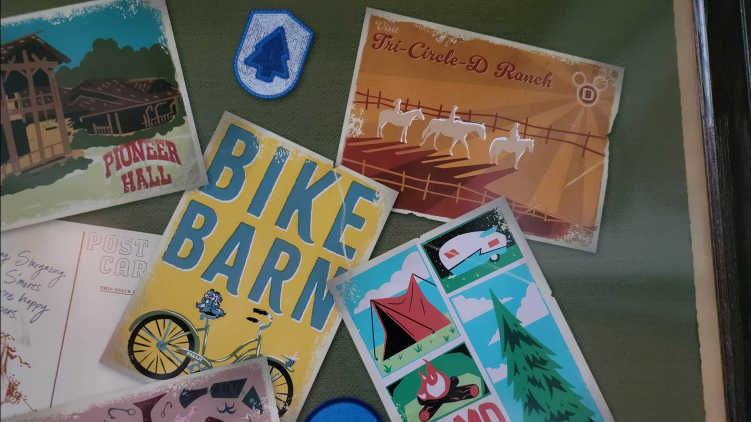A collage of different postcards makes up a poster on the wall, referencing many elements of Fort Wilderness past and present – including Pioneer Hall, River Country, and Tri-Circle D Ranch.