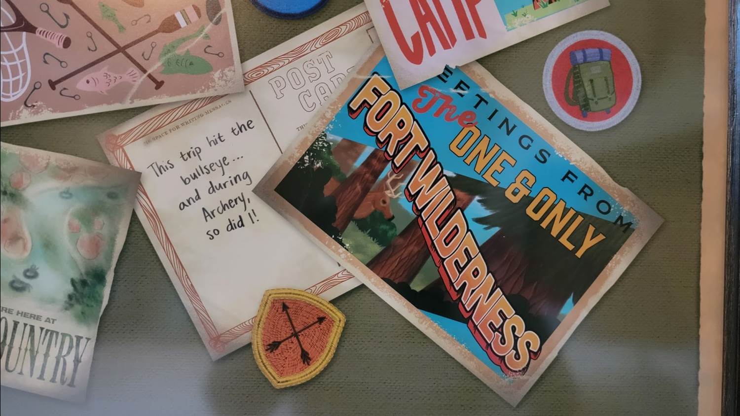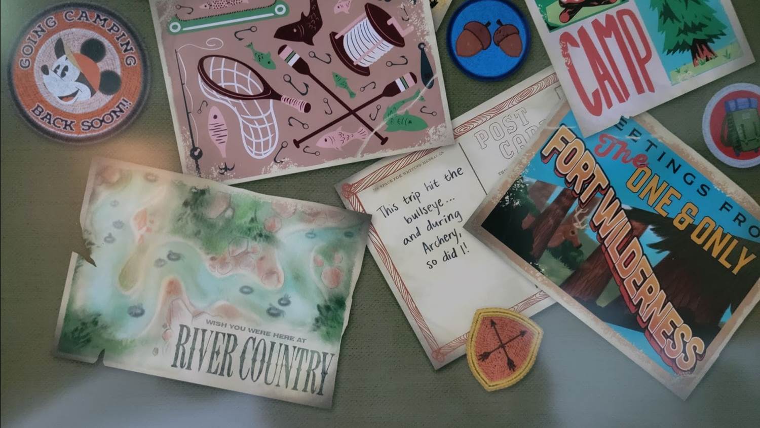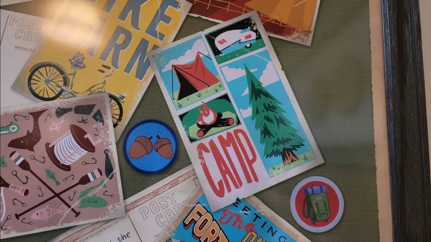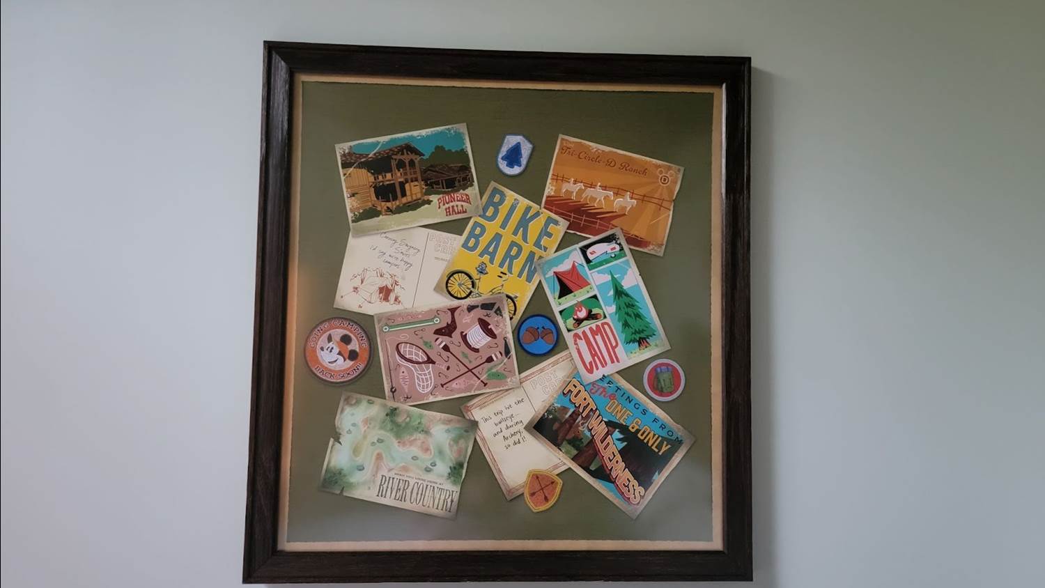 A collage of different postcards makes up a poster on the wall, referencing many elements of Fort Wilderness past and present – including Pioneer Hall, River Country, and Tri-Circle D Ranch.