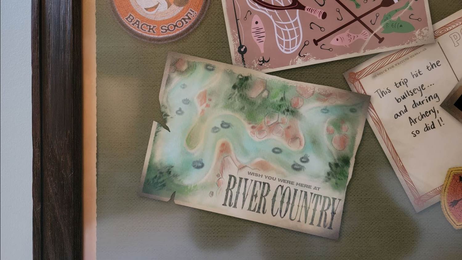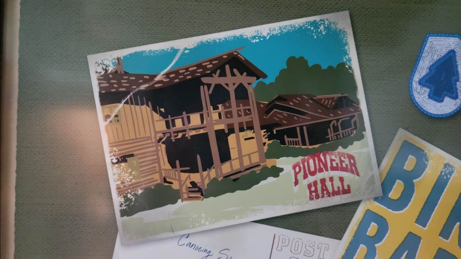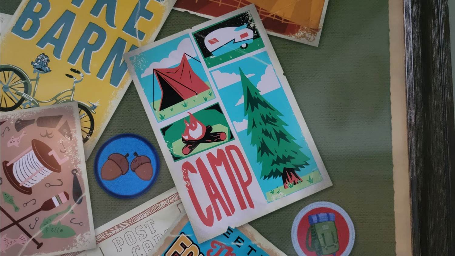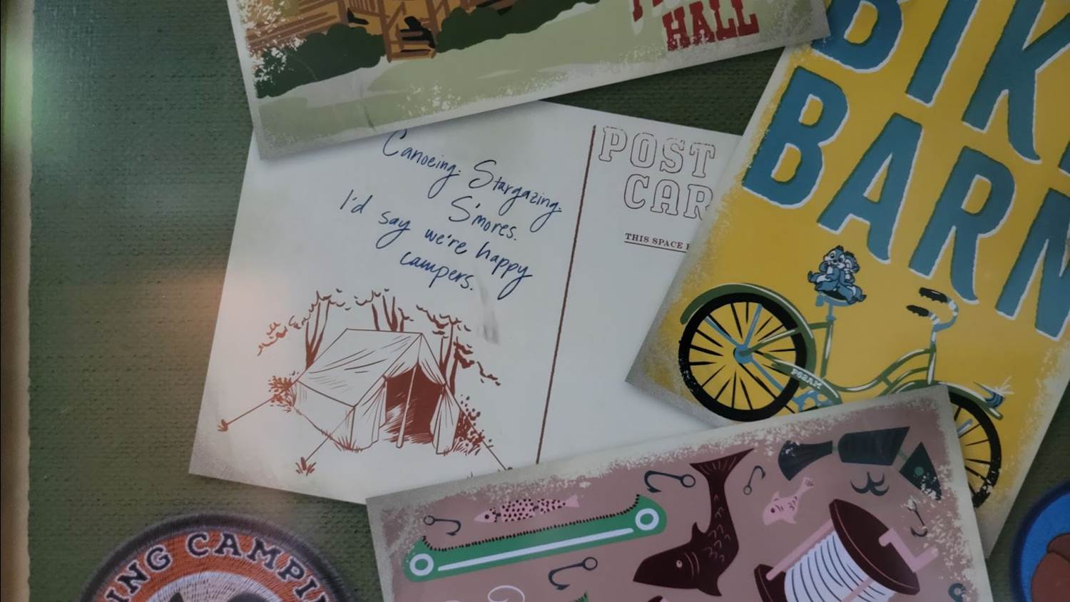 A collage of different postcards makes up a poster on the wall, referencing many elements of Fort Wilderness past and present – including Pioneer Hall, River Country, and Tri-Circle D Ranch.