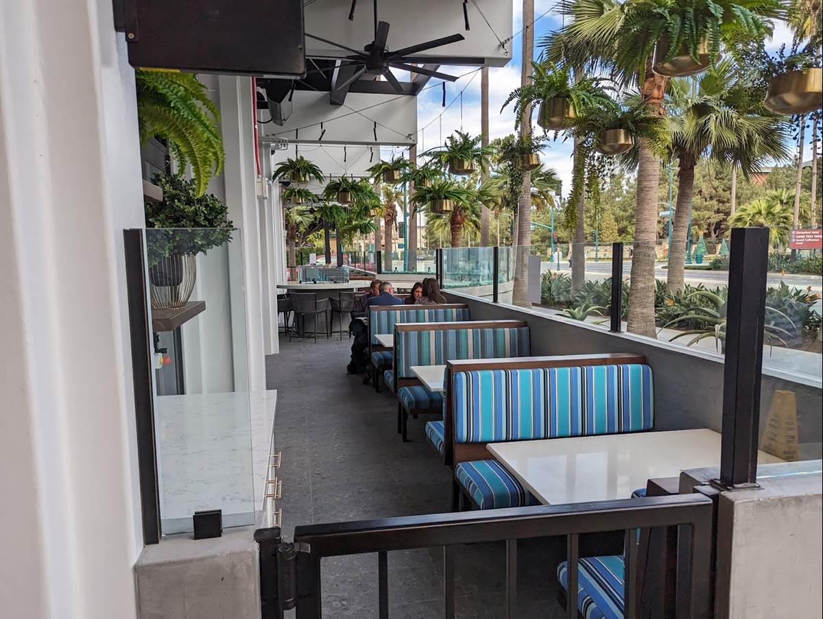 The landscaping and outdoor seating area has been set up, with large booths to add some comfort to your outdoor meal.