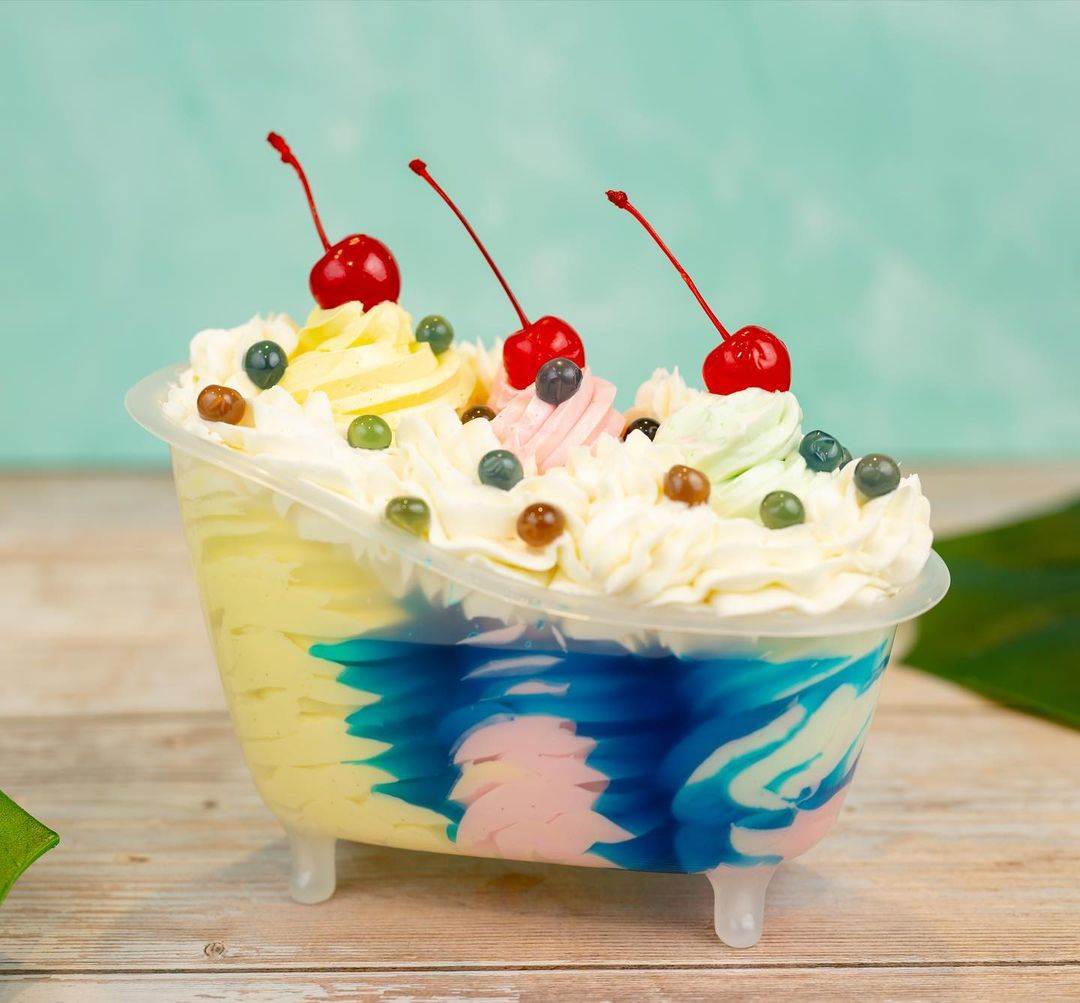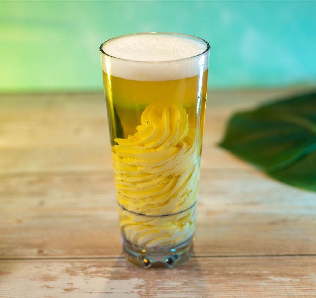 - Bathtub Float at Snack Shack: DOLE Whip and DOLE Whip strawberry, green matcha tea soft-serve, and Sprite topped with whipped cream, popping boba pearls, cherries, and blue simple syrup in a souvenir bathtub