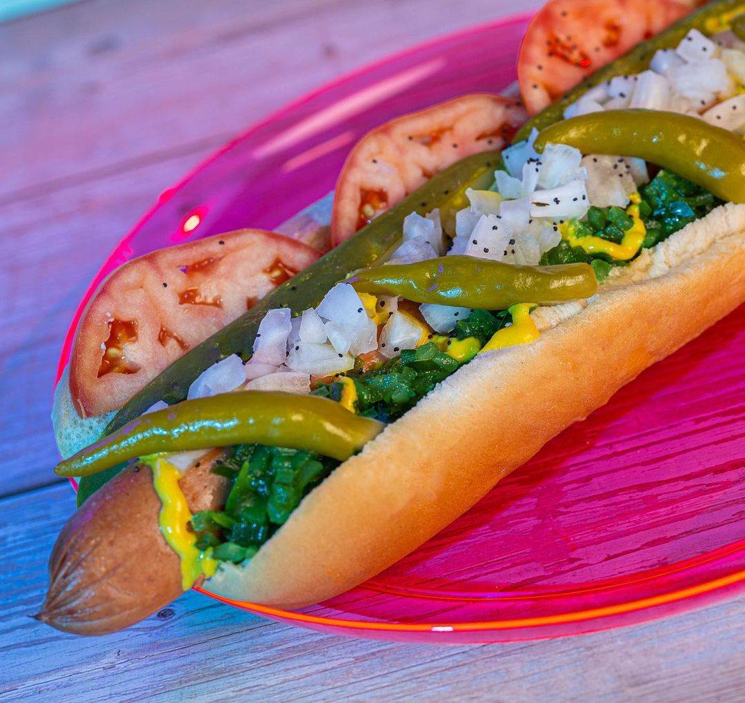 - NEW! Foot-long Loaded Hot Dog at Leaning Palms: Foot-long hot dog topped with tomatoes, onions, relish, mustard, and sport peppers