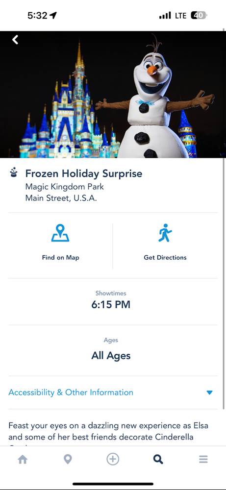 - And finally, the guide also features showtimes and more information about Frozen Holiday Surprise, the new stage show in front of Cinderella Castle.