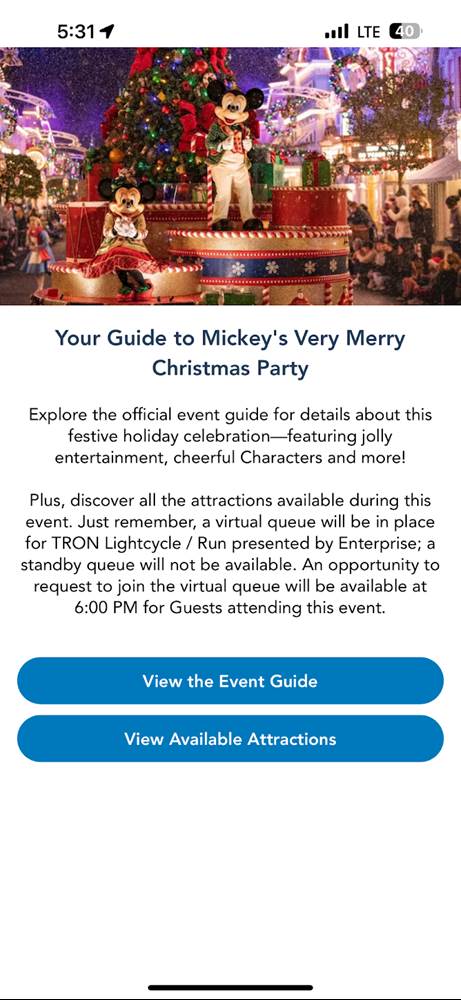 The My Disney Experience app updated today to include some new details for this year’s Mickey’s Very Merry Christmas Party at Walt Disney World’s Magic Kingdom.
