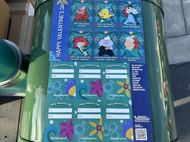 - You can get a free set of Valentine’s Day cards at Hollywood Studios today, featuring characters from The Little Mermaid. There is a QR code on the back of the set that sends you to a page hyping up the upcoming arrival of The Little Mermaid – A Musical Adventure show, which is opening this summer.