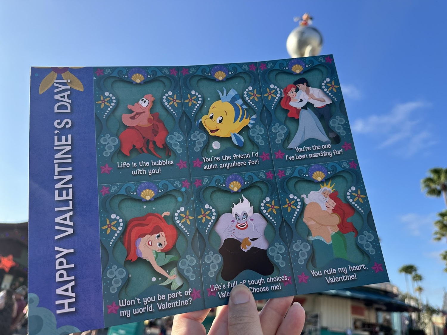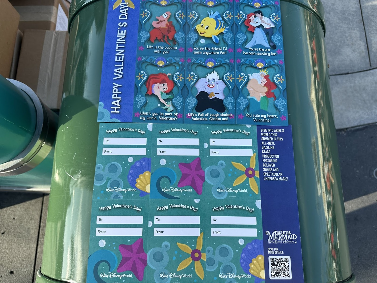 - You can get a free set of Valentine’s Day cards at Hollywood Studios today, featuring characters from The Little Mermaid. There is a QR code on the back of the set that sends you to a page hyping up the upcoming arrival of The Little Mermaid – A Musical Adventure show, which is opening this summer.
