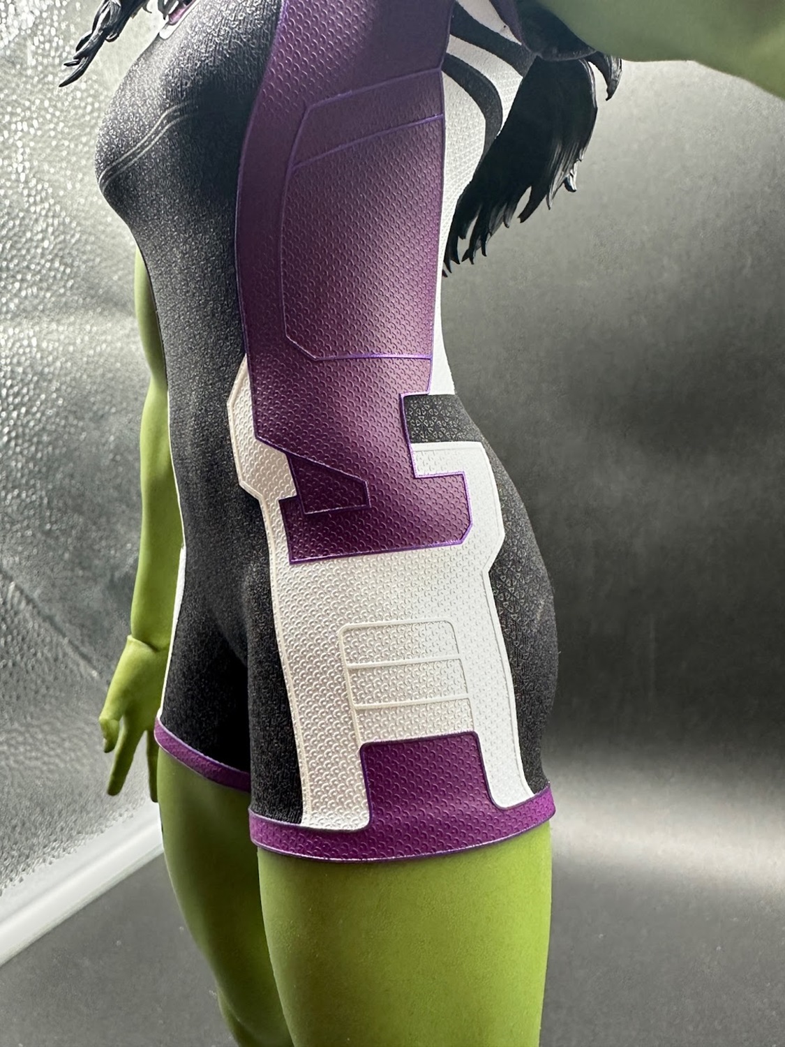 Given the need for her to show off those buff arms and legs to allow for maximum fight time mobility, She-Hulk’s costume isn’t elaborate, but you can see some nice design details on the figure. Hey, her renowned costume designer Luke Jacobson had to put in some layering and texture!
