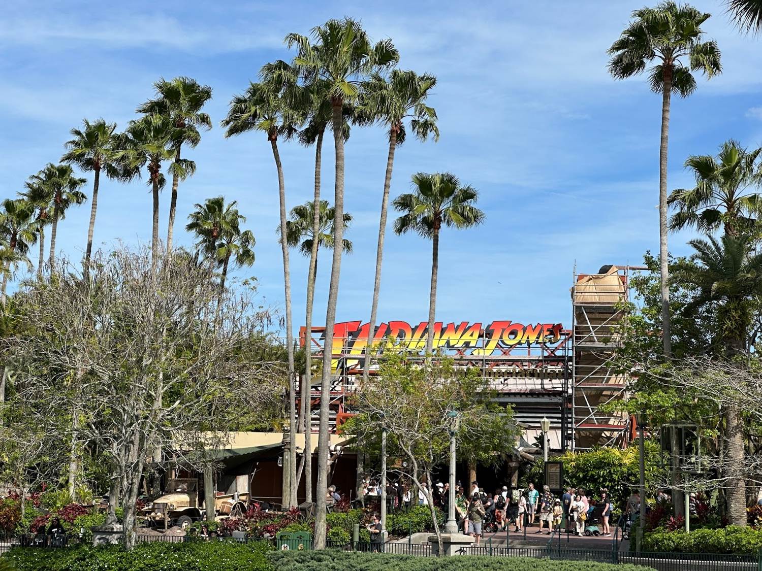 The iconic marquee of the Indiana Jones Epic Stunt Spectacular at Disney’s Hollywood Studios is currently getting some TLC. Included in the work is the giant Indiana Jones, which has towered over Echo Lake since the park first opened in 1989. However, he’s currently completely covered up by scaffolding and scrims.