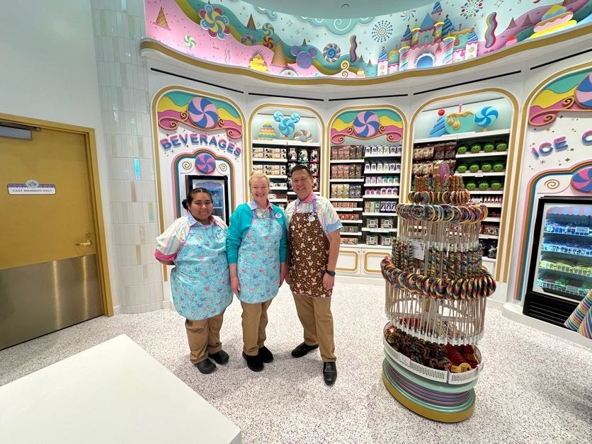 Another exciting part of any new Disney addition are the cast member costumes. Disney Wonderful World of Sweets’ outfits are just as colorful as the new store. With pastel striped shirts, khakis, an optional cardigan, and multiple apron styles, the fun of candy can be found everywhere.