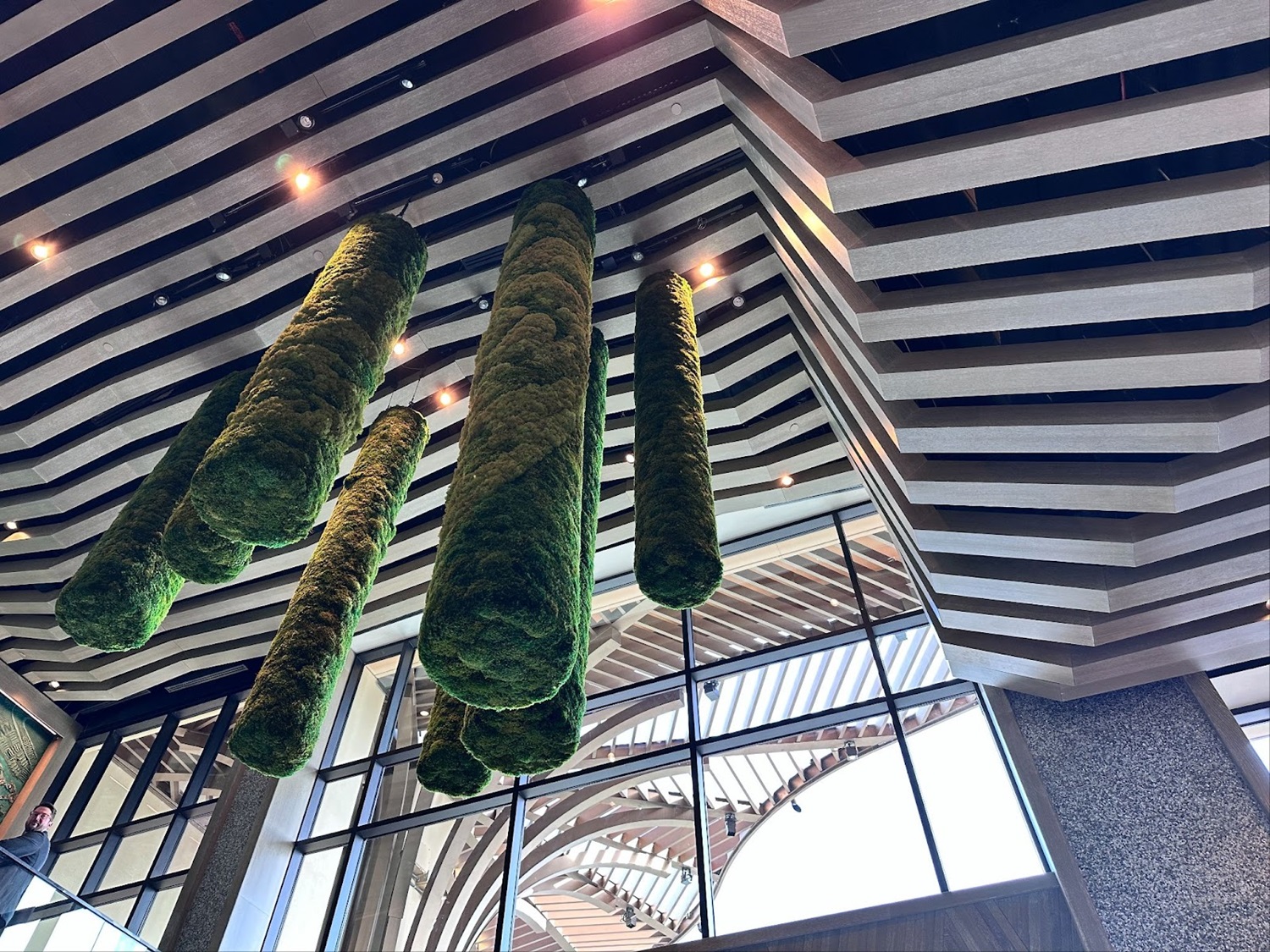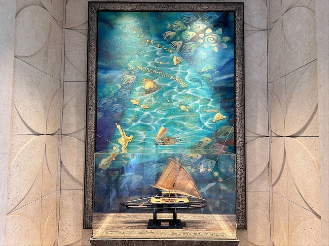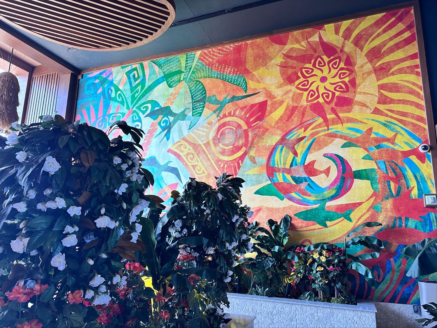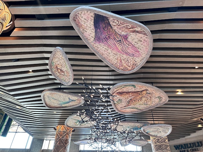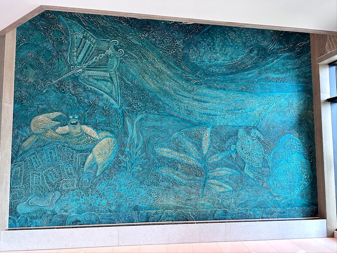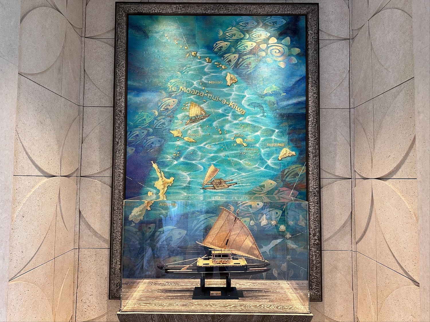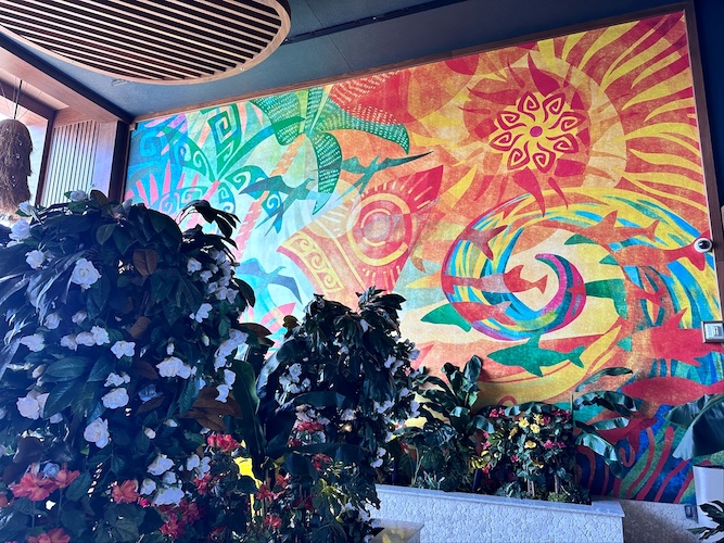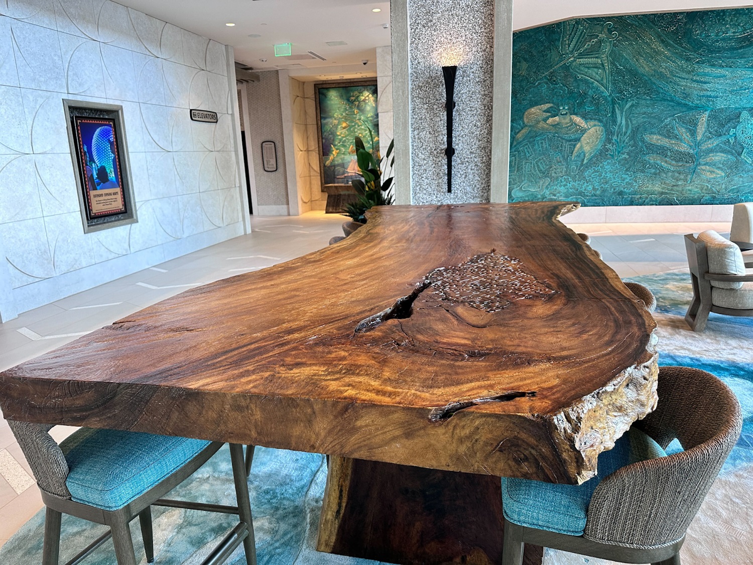 Stepping into Island Tower at Disney’s Polynesian Villas & Bungalows, guests are welcomed into a spacious and open paradise, inspired by the art of wayfinding and the natural elements used by the navigators to explore the oceans. The lobby also boasts impressive art installations, including an impressive 3 story tall mural that tells the tale of the sea and sky. Make sure you take a look at this incredibly crafted art piece, as you may find some of your favorite Moana characters throughout.
