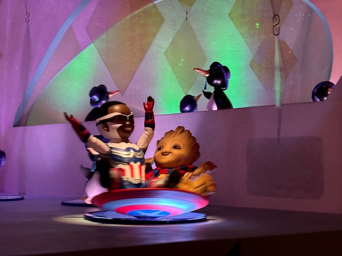 - Groot features in many different outfits and stylings throughout the attraction, alongside many other characters from the Marvel Cinematic Universe. Who do you spot?