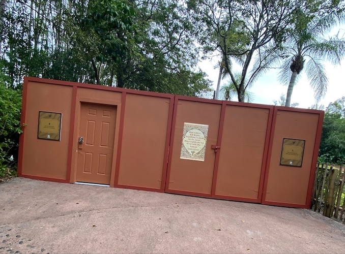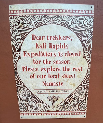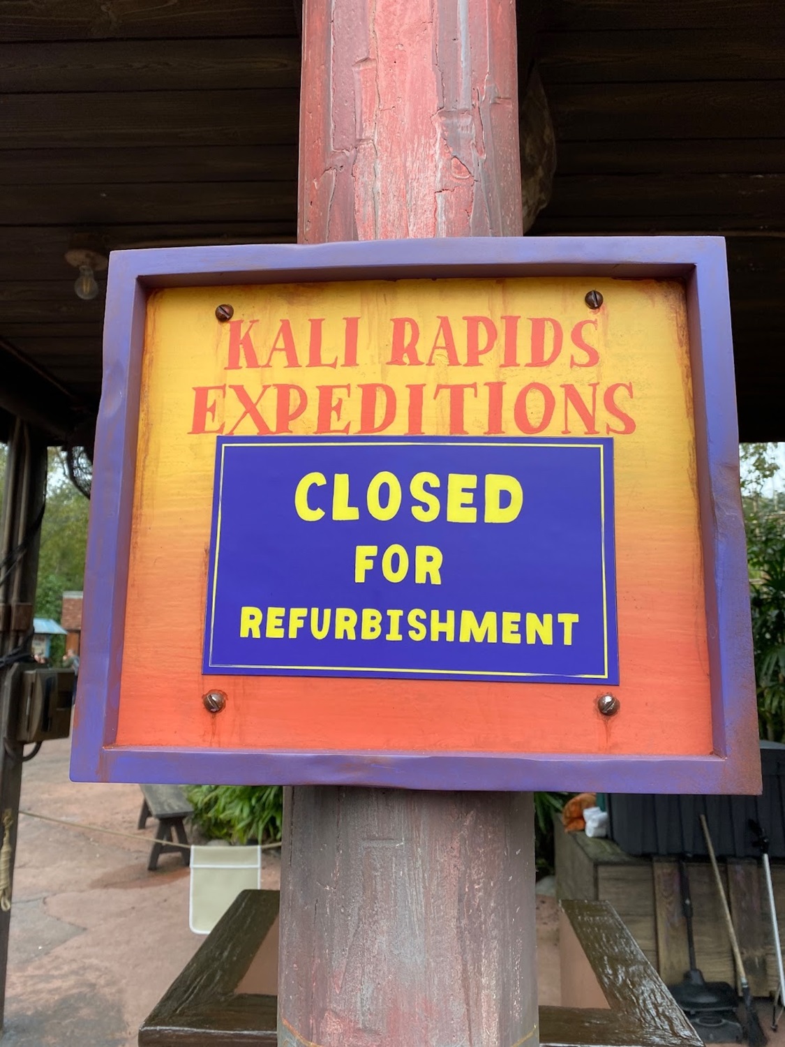 A wonderful themed sign on the construction walls lets guests know that Kali River Expeditions are not taking place at this time.