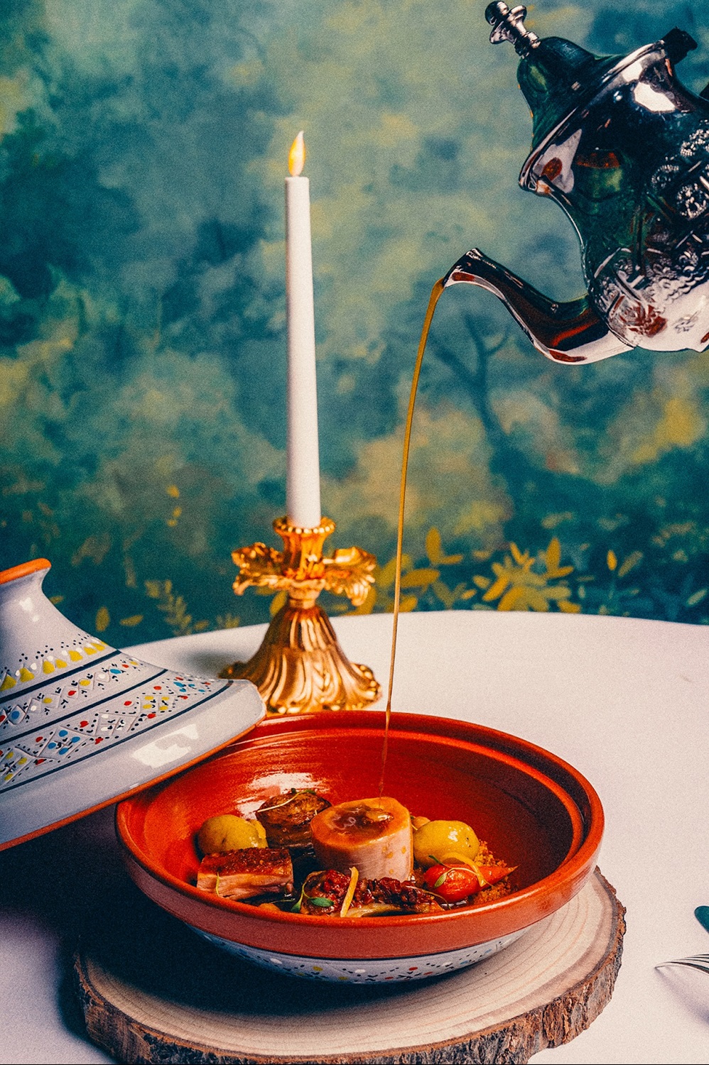 - The story continues with Prince Ali’s tagine, taking inspiration from Aladdin and features a poularde ballotin stuffed with dates and dried fruits served with vegetables.