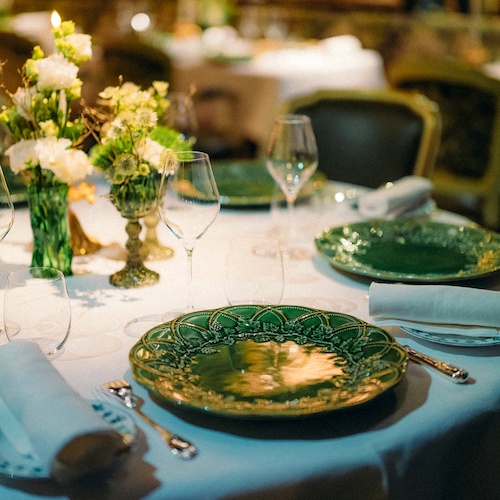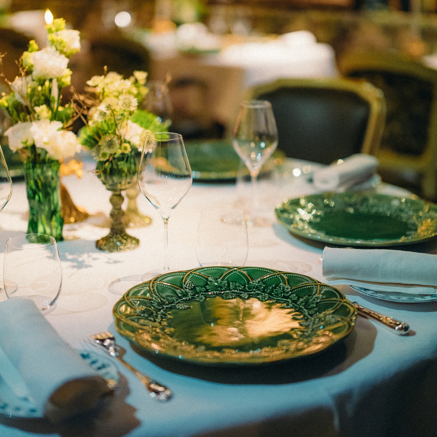 - These details were even translated into the dining ware, which includes botanical-themed dishes designed by Bernardaud House, along with a selection of silverware from Christofle.