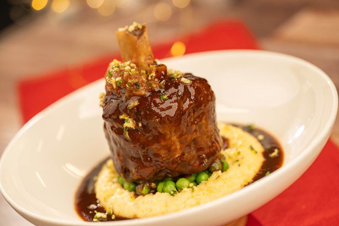 - Braised Pork Osso Buco: Creamy polenta, roasted cipollini onions, sweet peppers, and lemon gremolata