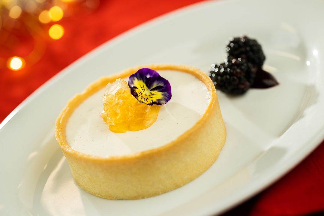 - Goat Cheese Mousse Tart topped with honeycomb and an edible flower served with blackberries and a cassis compote