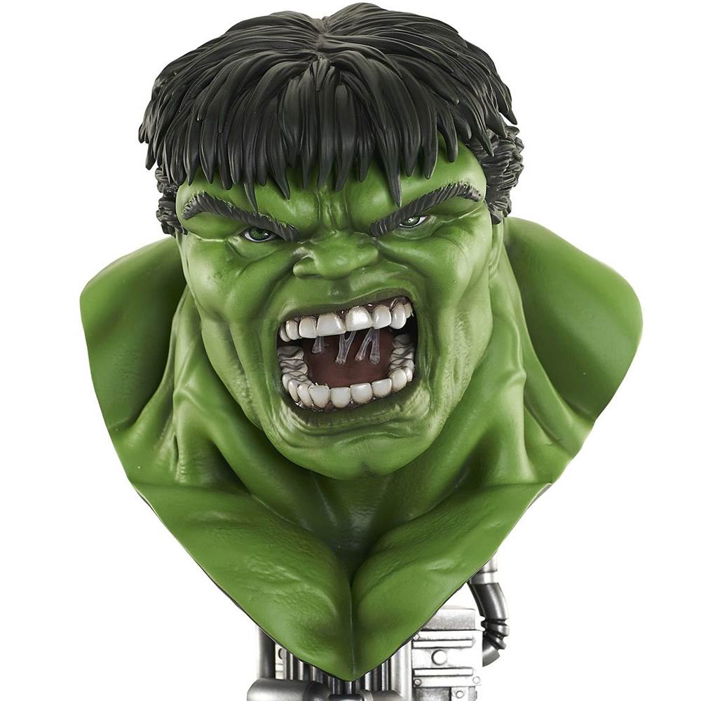 “The Hulk is bustin' out! This bust captures him at his angriest as he sits atop a base styled after the Gamma Bomb that gave him his powers."