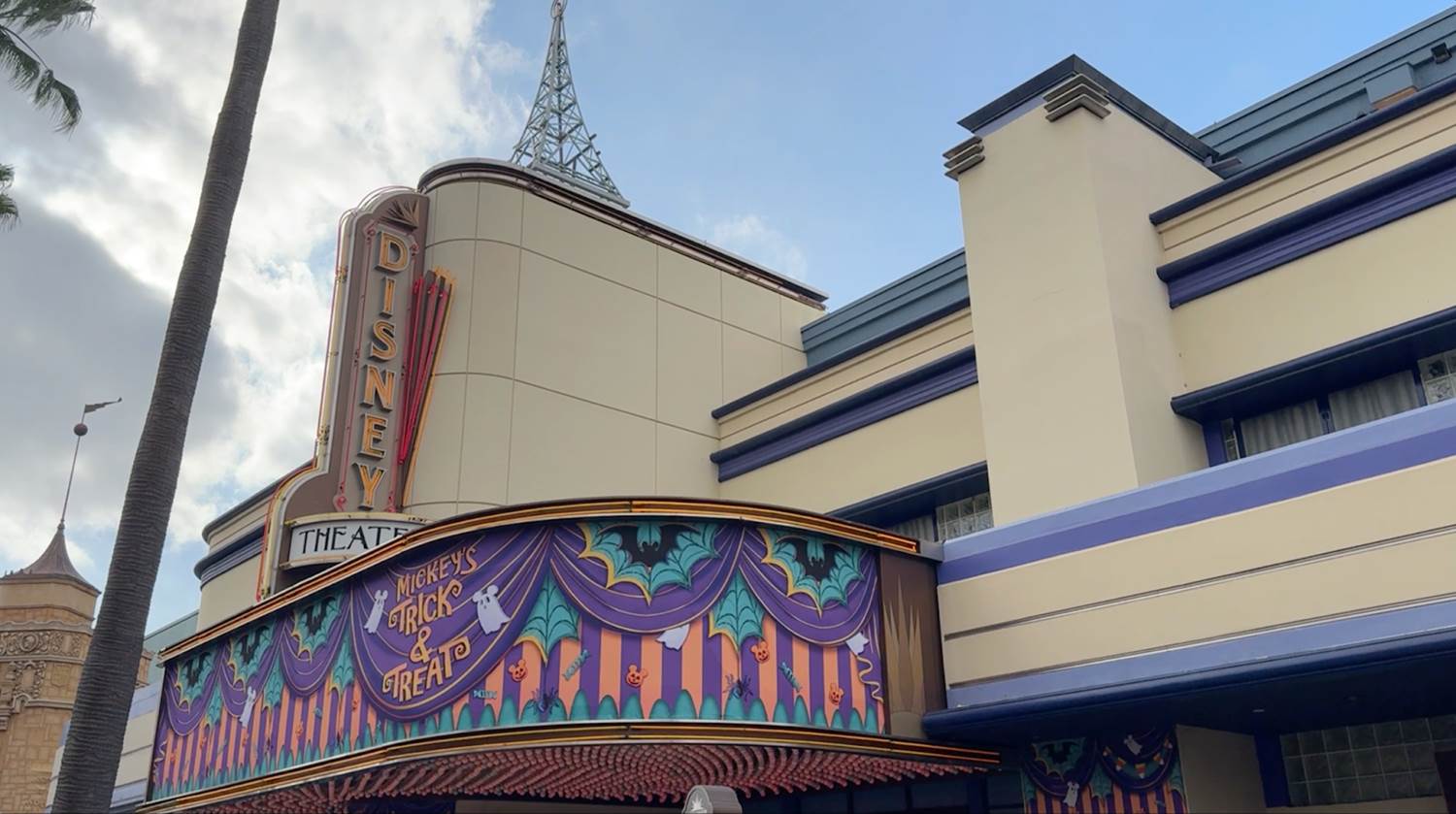 - With that, the Disney Theatre marquee has received a colorful Halloween overlay for the season.