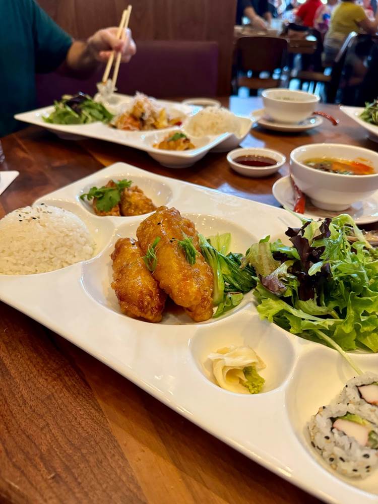 - Orange Chicken with mixed green salad, crispy chicken dumpling (2) and kanikama sushi roll (2) for $27