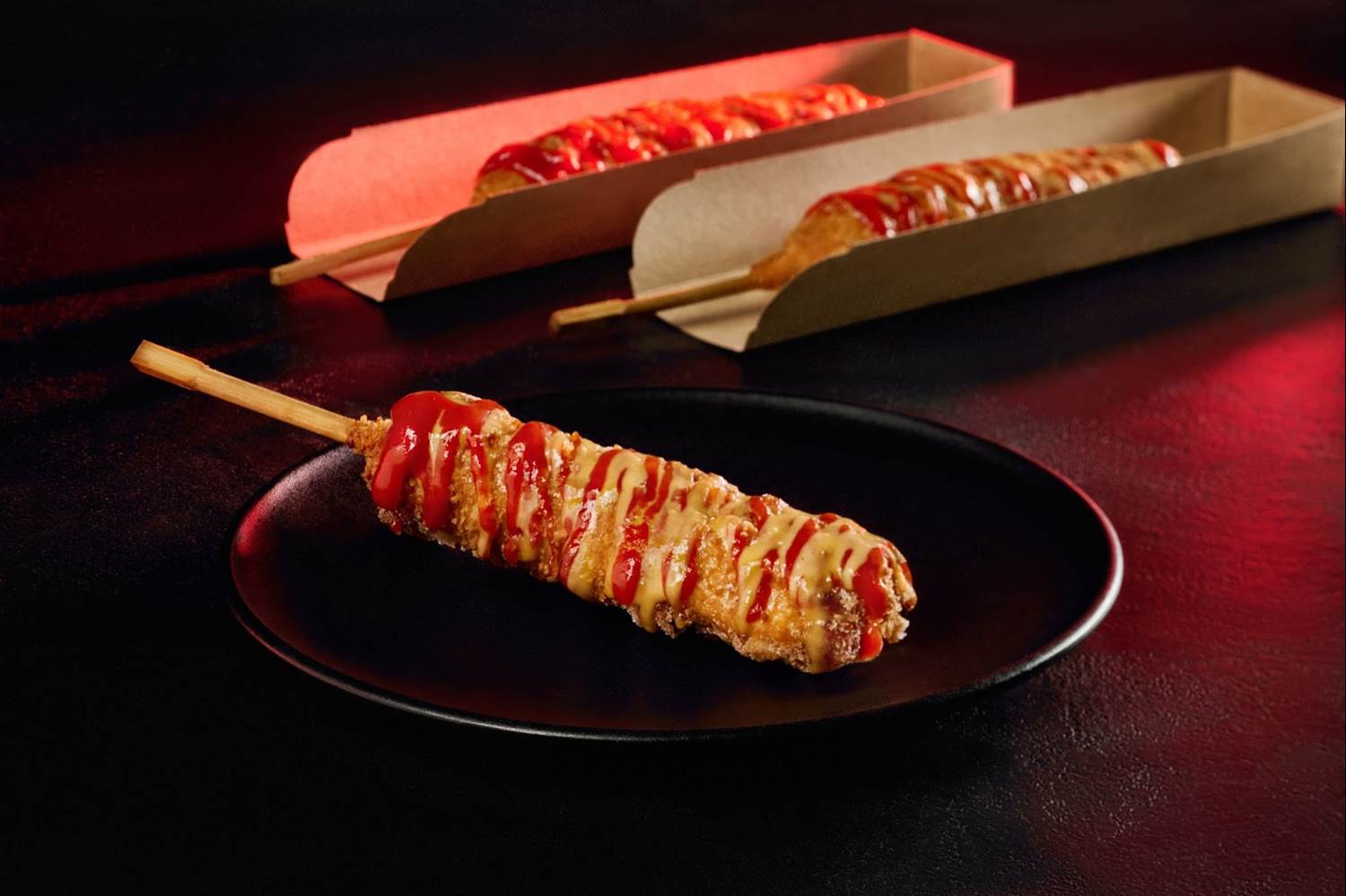 - Korean Corn Dog: Beef hotdog, mozzarella cheese, Panko bread crumbs, Sriracha ketchup and honey mustard.
