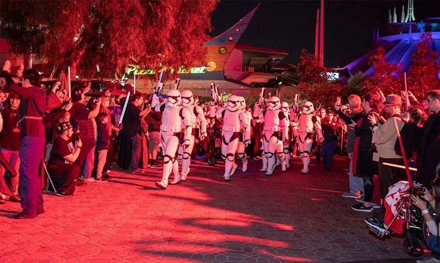 - Guests in Star Wars-themed costumes are invited to participate in a special cavalcade, where they will join Mickey Mouse and Minnie Mouse in a march down Main Street, U.S.A., culminating in a group photo in front of Sleeping Beauty Castle, illuminated with galactic projections.