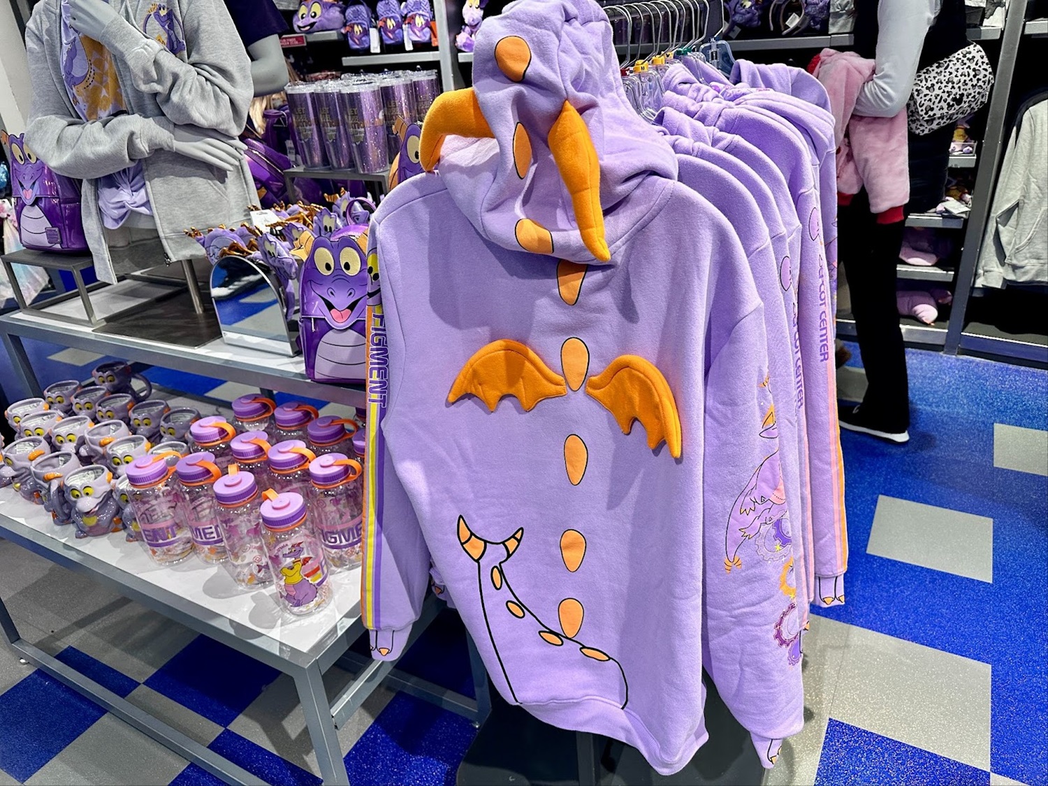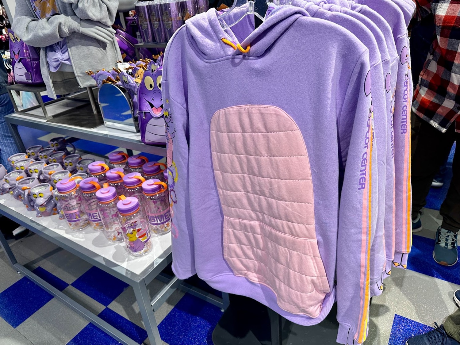 Retailing for $79.99, this new Figment hoodie is inspired by the dragon’s iconic features, including his pink belly, horns, wings and tail. While EPCOT has sold a similar zip-up version of this hoodie, this new product showcases Figment’s adorable design much better. Even the inner lining contains homages to EPCOT and Journey into Imagination.