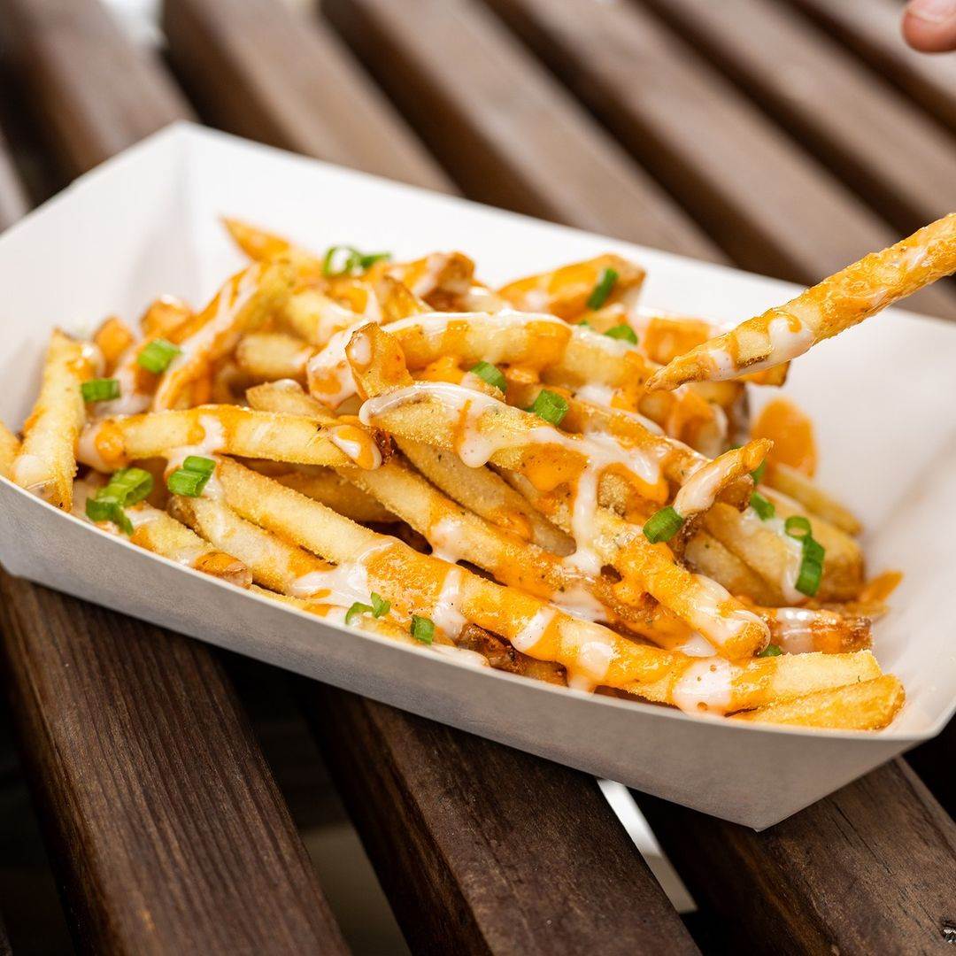 - Buffalo Fries – Ranch-seasoned french fries drizzled with buffalo-ranch sauce and blue cheese dressing (above)