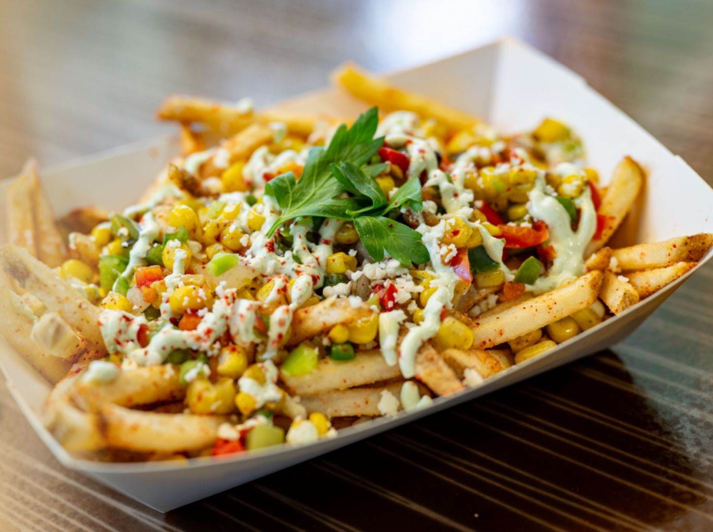 - Street Corn Fries – French fries topped with roasted corn relish, cotija cheese, and cilantro-lime crema (above)
