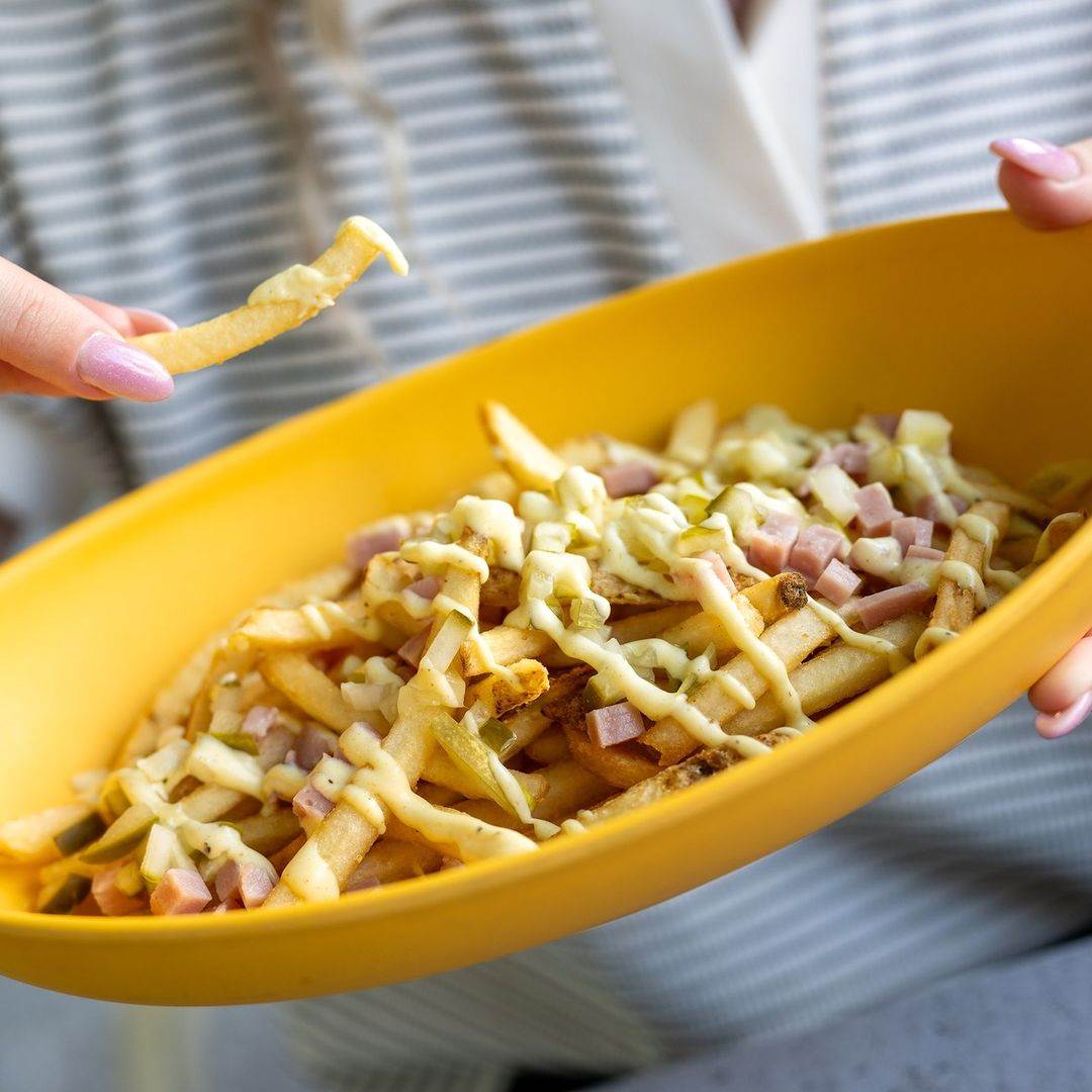 - Cuban Fries – Seasoned french fries topped with mustard and Swiss cheese sauce, ham, and pickles (above)