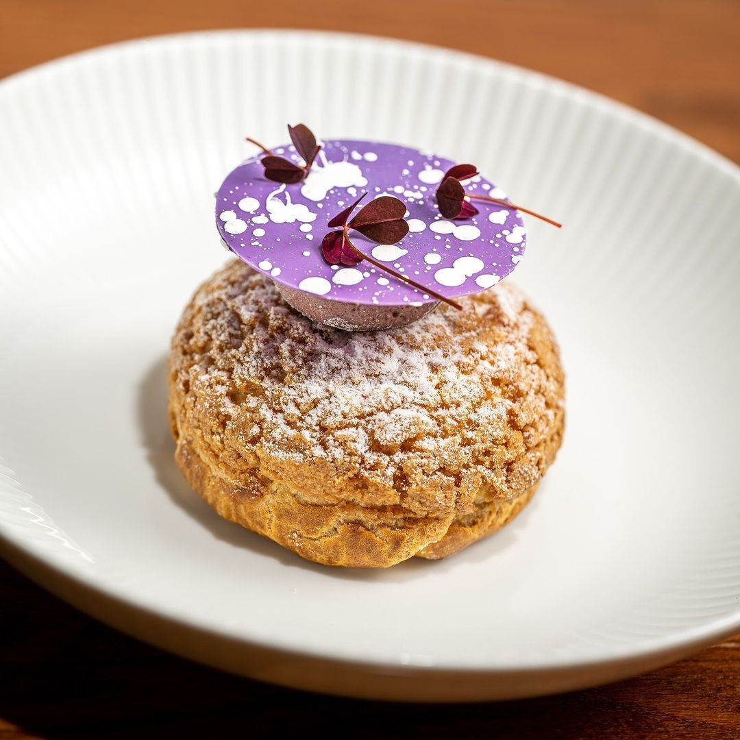 - Profiterole: Craquelin, cheesecake inlay, marionberry, and sorrel