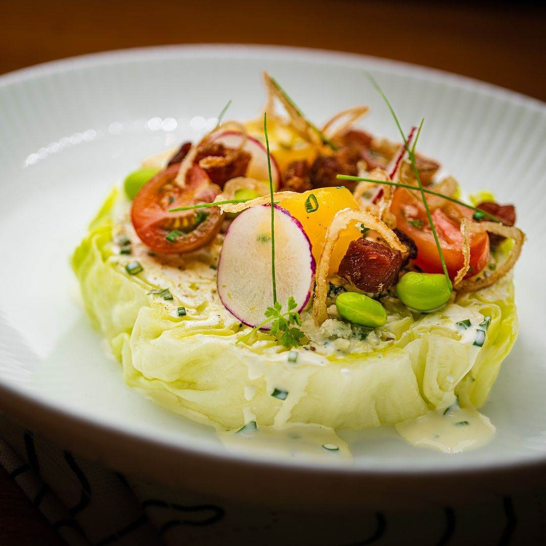 - Steakhouse Wedge Salad with tomatoes, bacon lardons, edamame, ranch dressing, blue cheese, and crispy onions