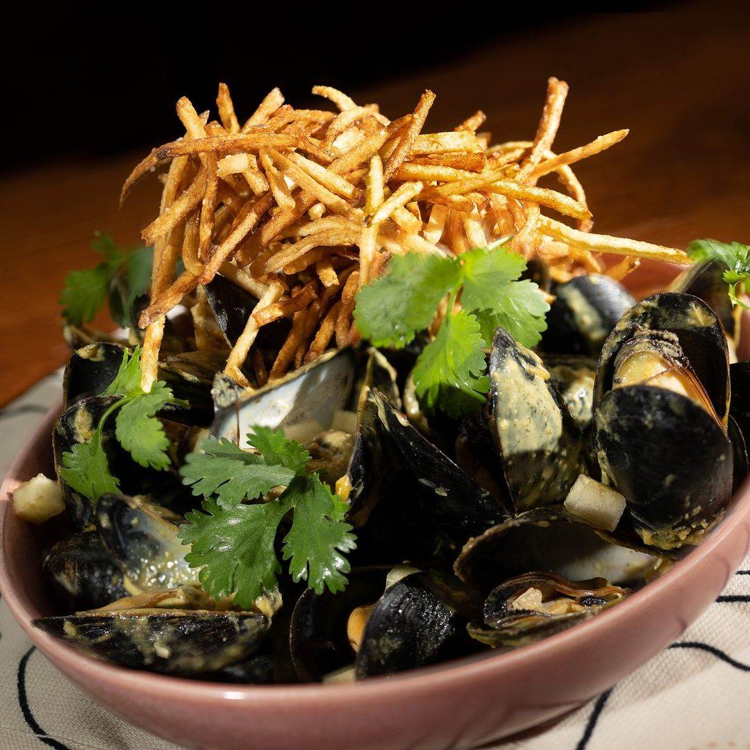 - Canadian Cove P.E.I. Mussels: Vadouvan curry, yogurt, herb pistou, and pommes frites