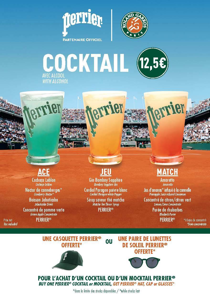 - If you buy one of these Perrier cocktails or mocktails, you'll get a Perrier hat, cup, or sunglasses while supplies last.