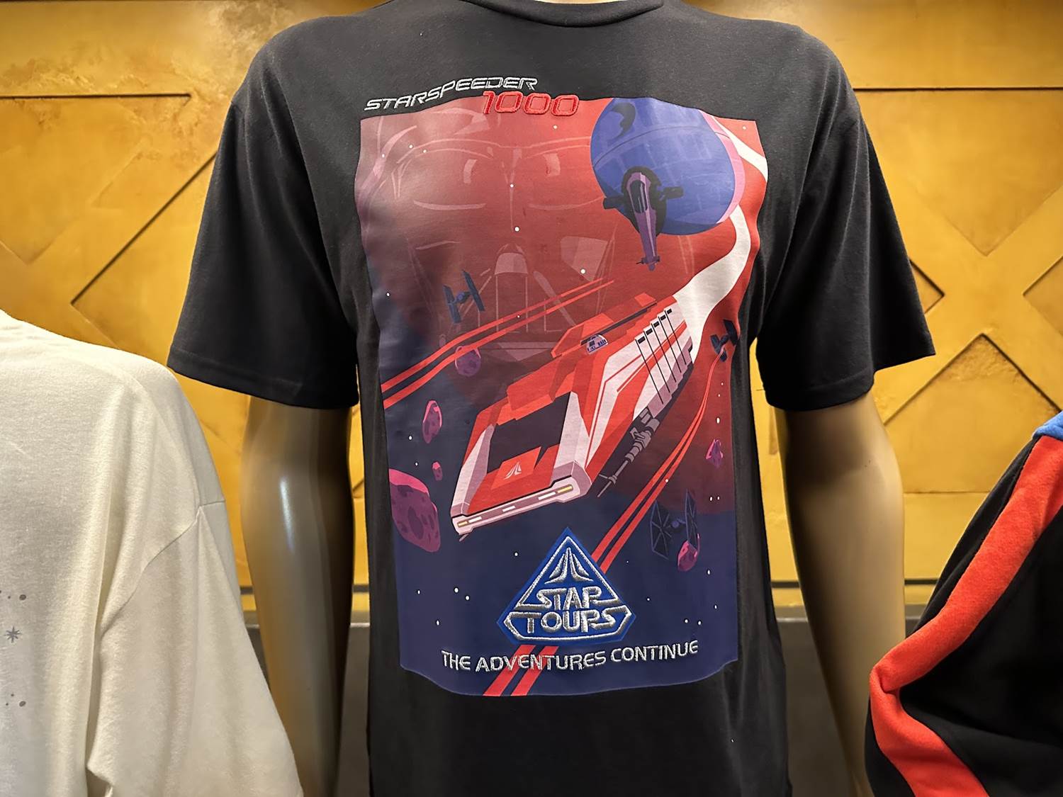 For more updated fun, a new shirt also sports the Starspeeder 1000 in a poster-style print that features many of the visuals one might see on the attraction - namely from the original trilogy of Star Wars films. This includes TIE fighters, Boba Fett’s ship, the Death Star, and Darth Vader ominously embedded behind the striking visuals.